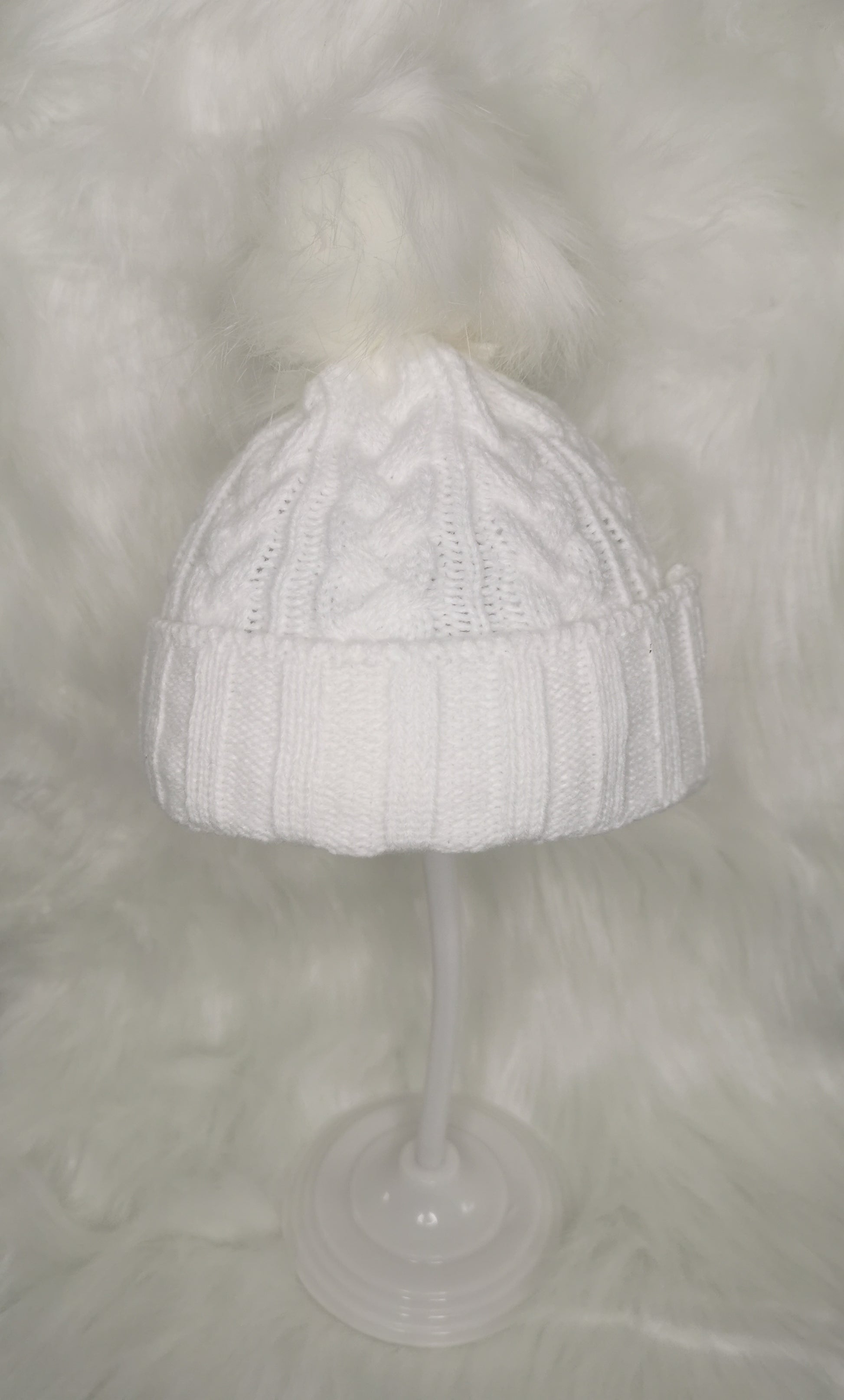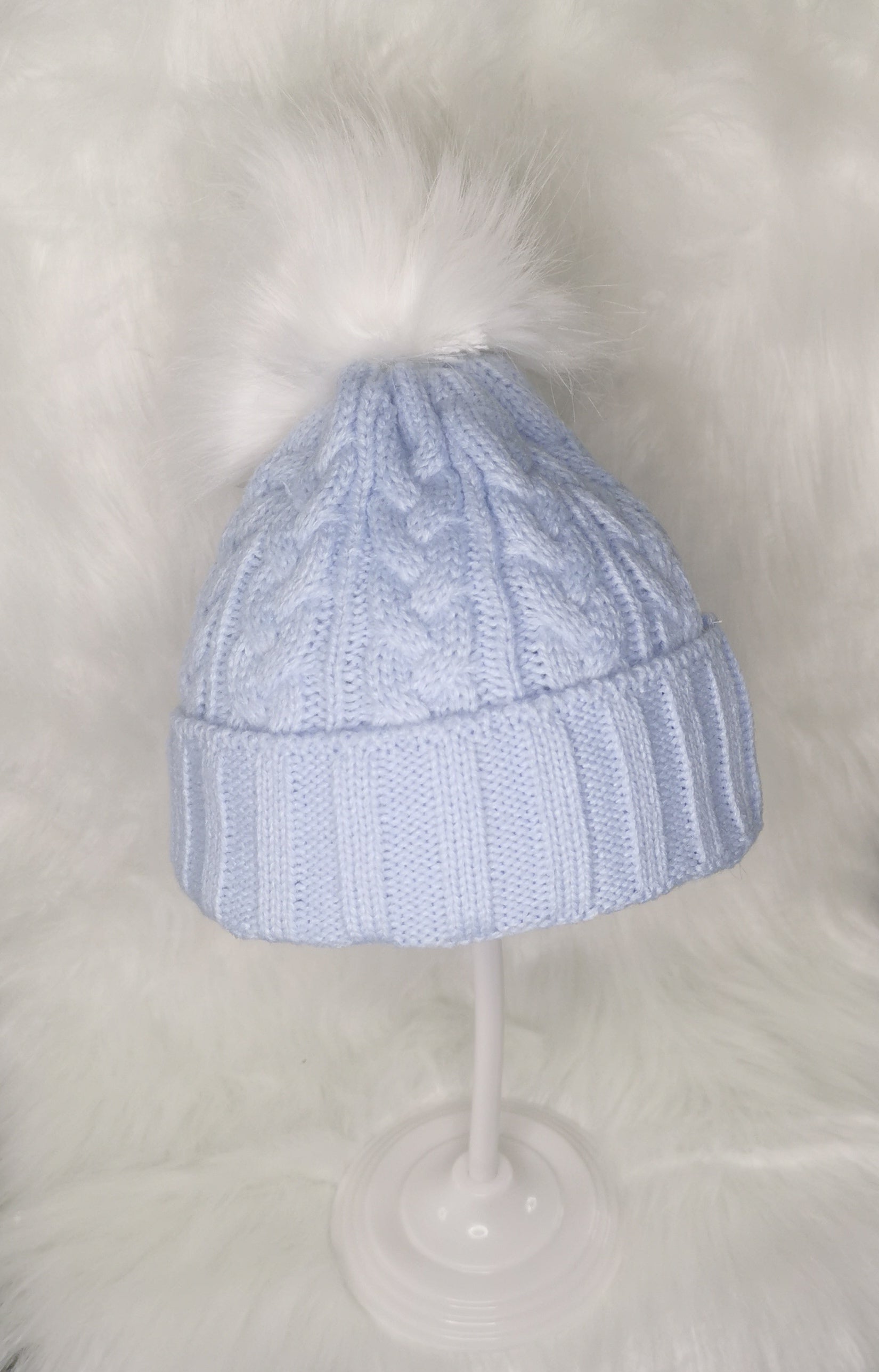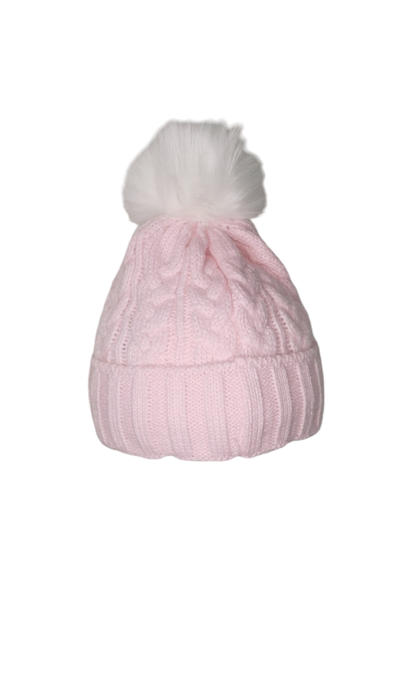 This soft and cosy cable knit beanie hat is finished with an artificial fur pom. Available in a range of colours to compliment any outfit.