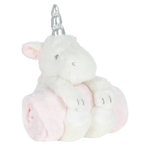 Little ones will love snuggling with their new unicorn companion. Featuring a super soft heart embossed blanket which can be rolled up into the unicorns arms.