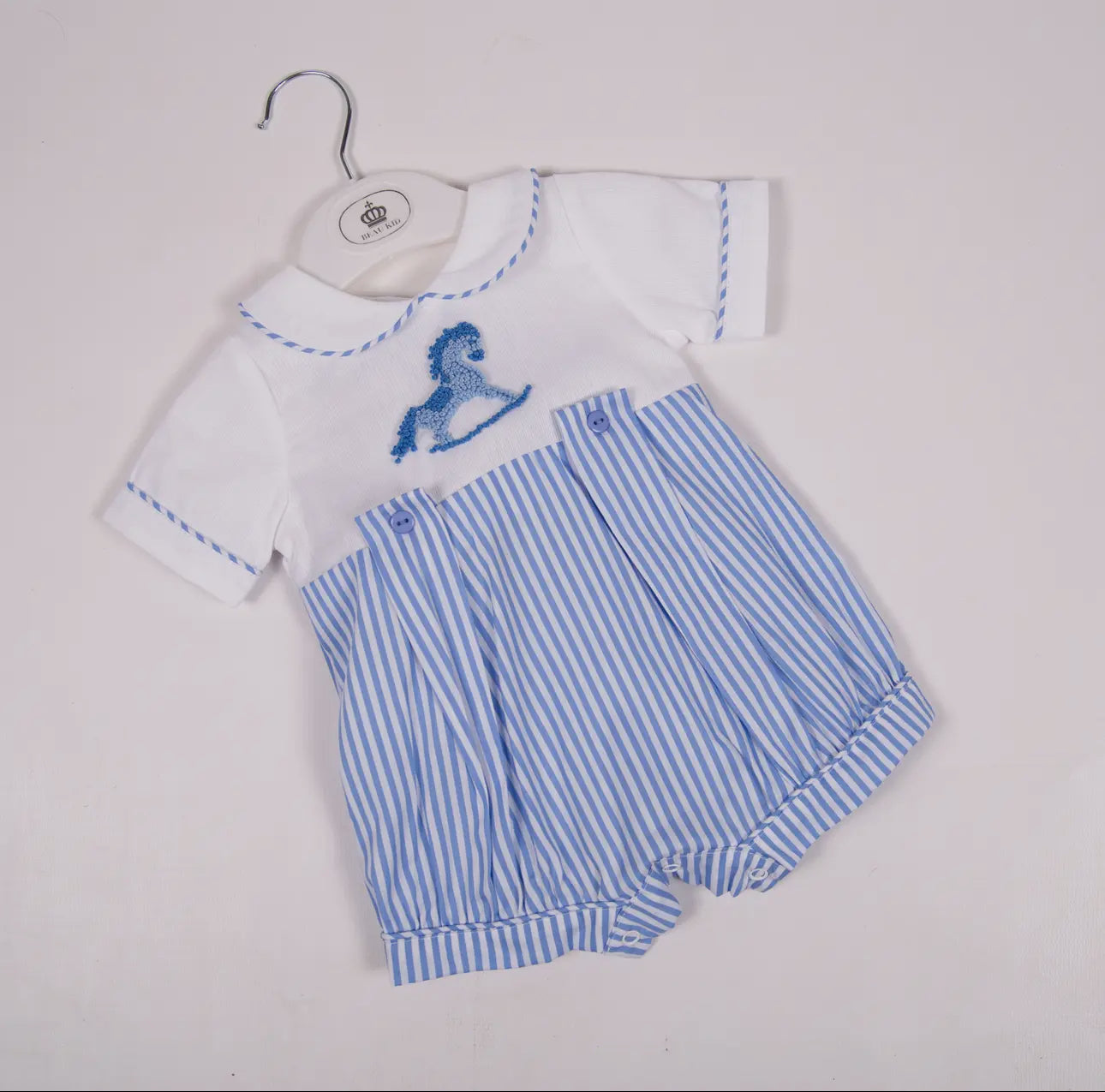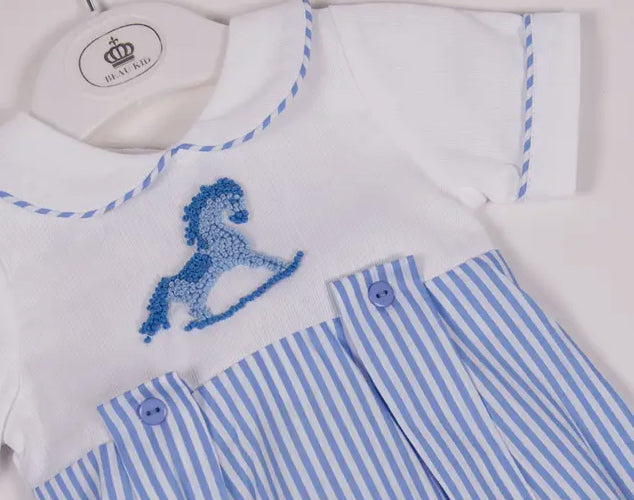 Classic charm meets everyday comfort in this adorable cotton romper. Featuring soft blue and white stripes, pleated front detail, and a sweet rocking horse motif, it's finished with smart back button fastening for easy dressing.