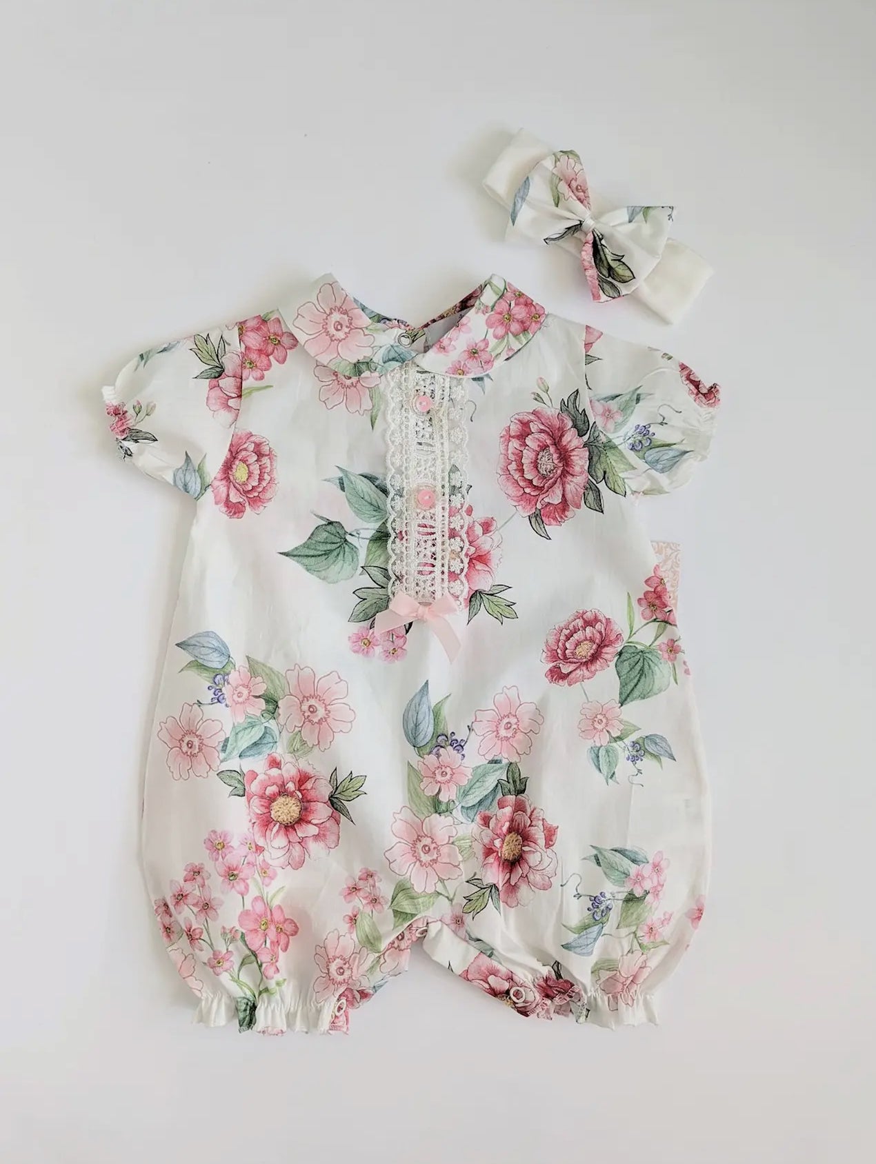 Let your little flower shine in this beautiful romper! Featuring a vintage inspired print with soft pink blossoms, delicate lace trim, and a sweet little bow, it's full of charm and comfort. Complete with a matching headband, this little outfit is perfect for everyday wear.