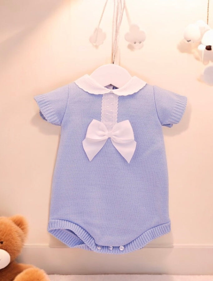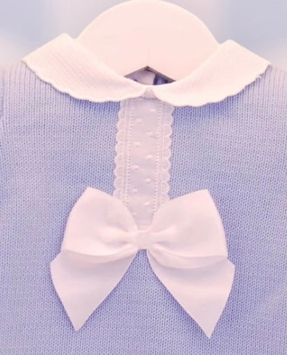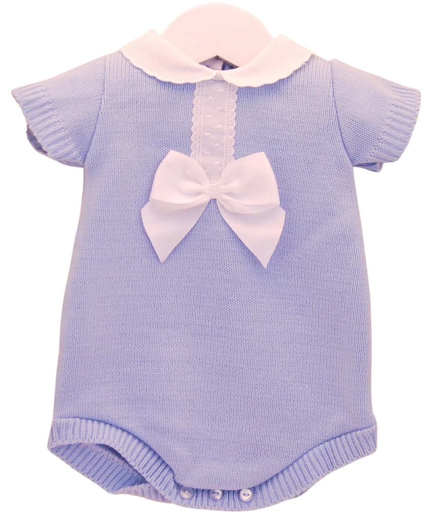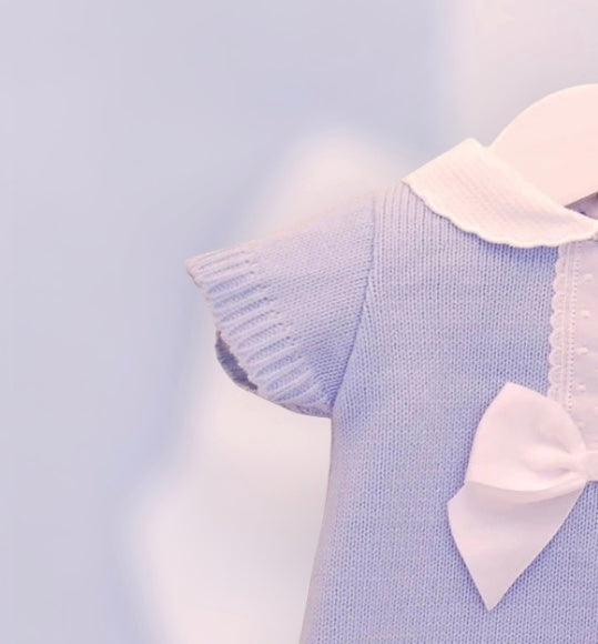 Softly knitted in a beautiful dusky hue, our Bonita romper is a lovely outfit whatever the occasion. With beautiful contrast white lace and bow detailing and a classic peter pan style collar. To the back and between the legs there are handy buttons.