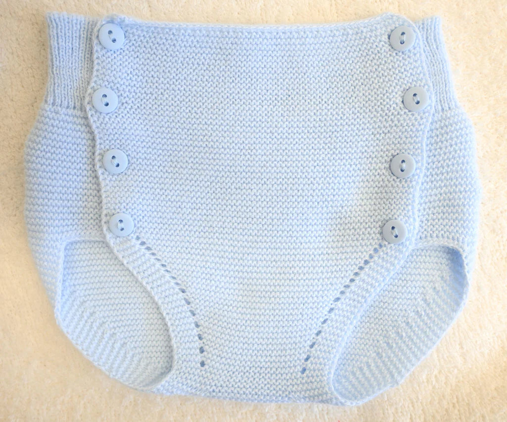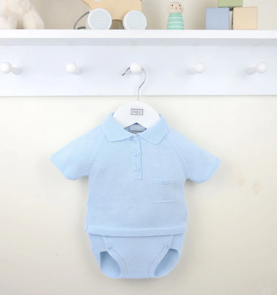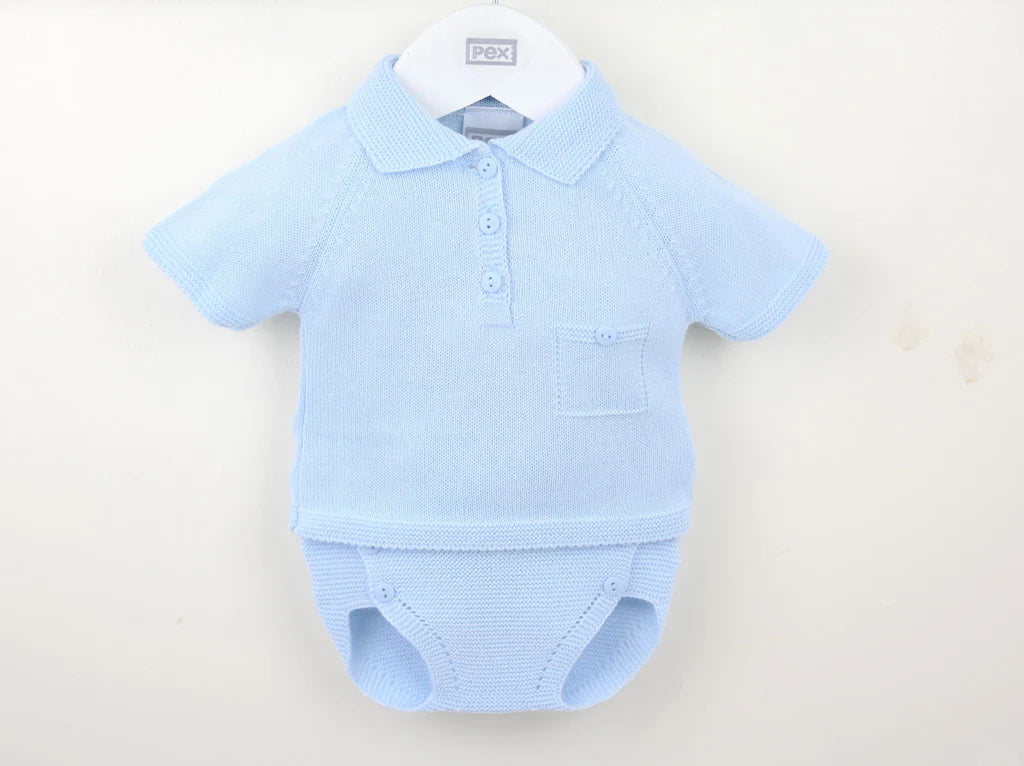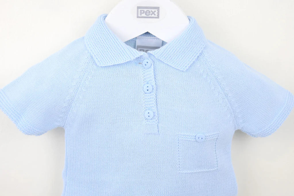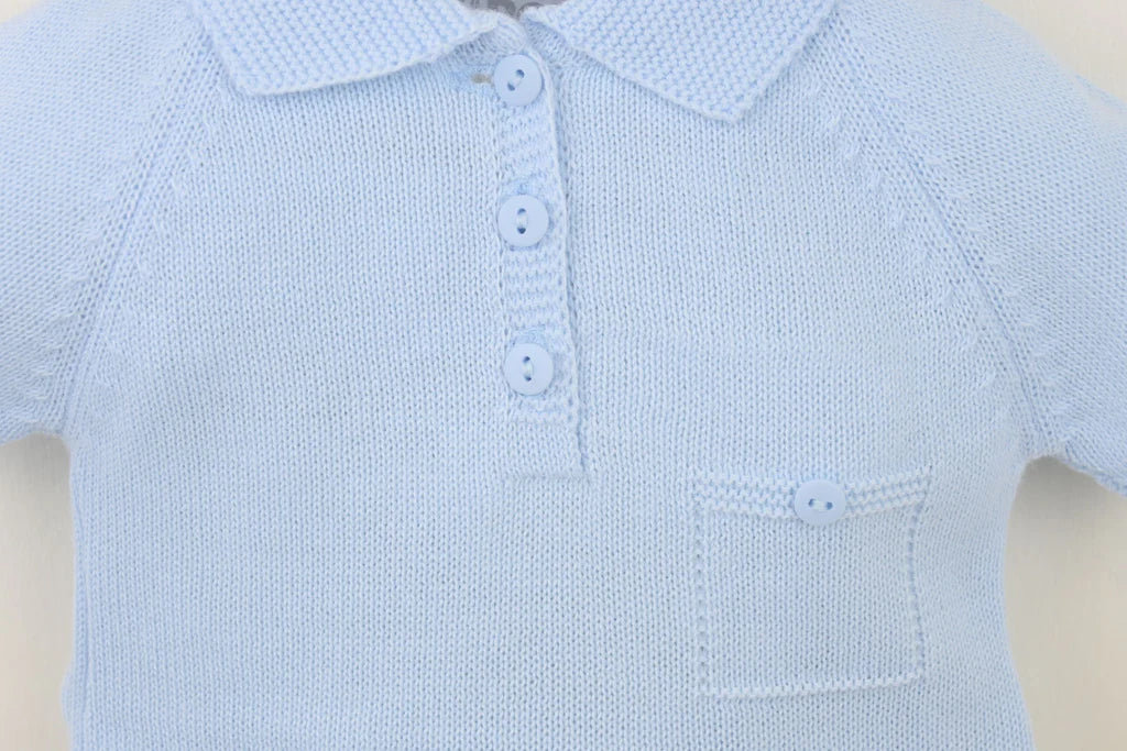 Knitted in a super smart pale blue fine yarn this perfect classic pants suit is an ideal instant outfit for warmer days. Featuring a textured knit collar with polo button neckline and elegant mock button pocket at the chest. The matching pants are in a textured knit and feature an eight button front opening. Simple yet sophisticated design that is perfect whatever the occasion.