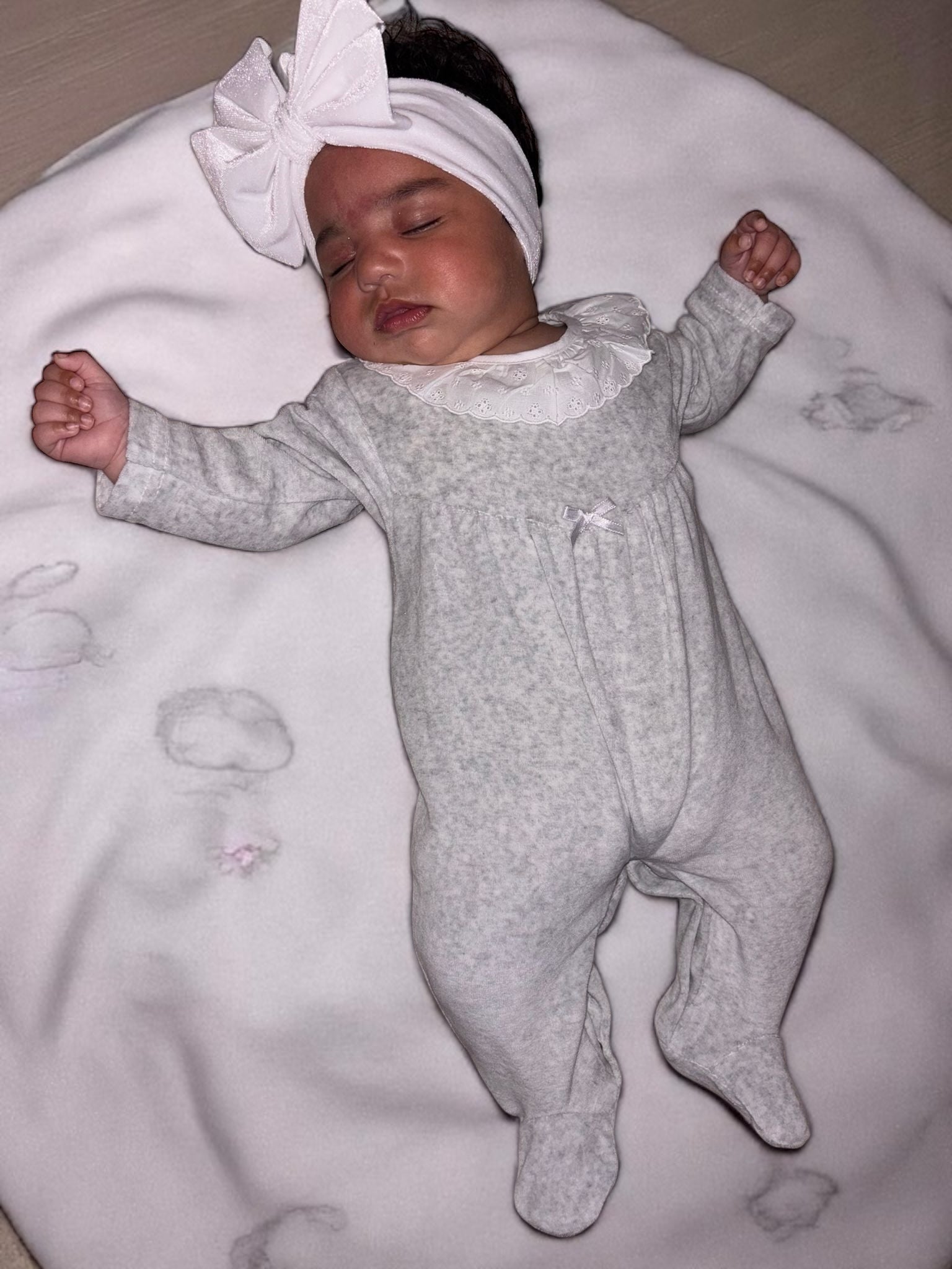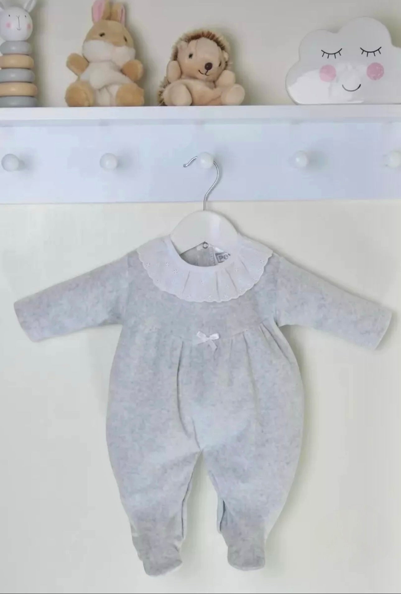 This soft grey velour sleepsuit is the perfect blend of comfort and elegance for your little one. Featuring a delicate broderie anglaise collar and a dainty satin bow detail, it’s designed to keep baby cosy while looking adorable. The gentle velour fabric is warm, snuggly, and kind to delicate skin, making it ideal for both day and night wear.