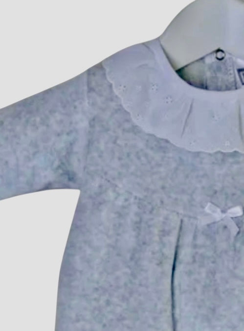 Broderie Lace Collar Sleepsuit - Silver Grey Velour Sleepsuit With Lace Trimmed Neckline