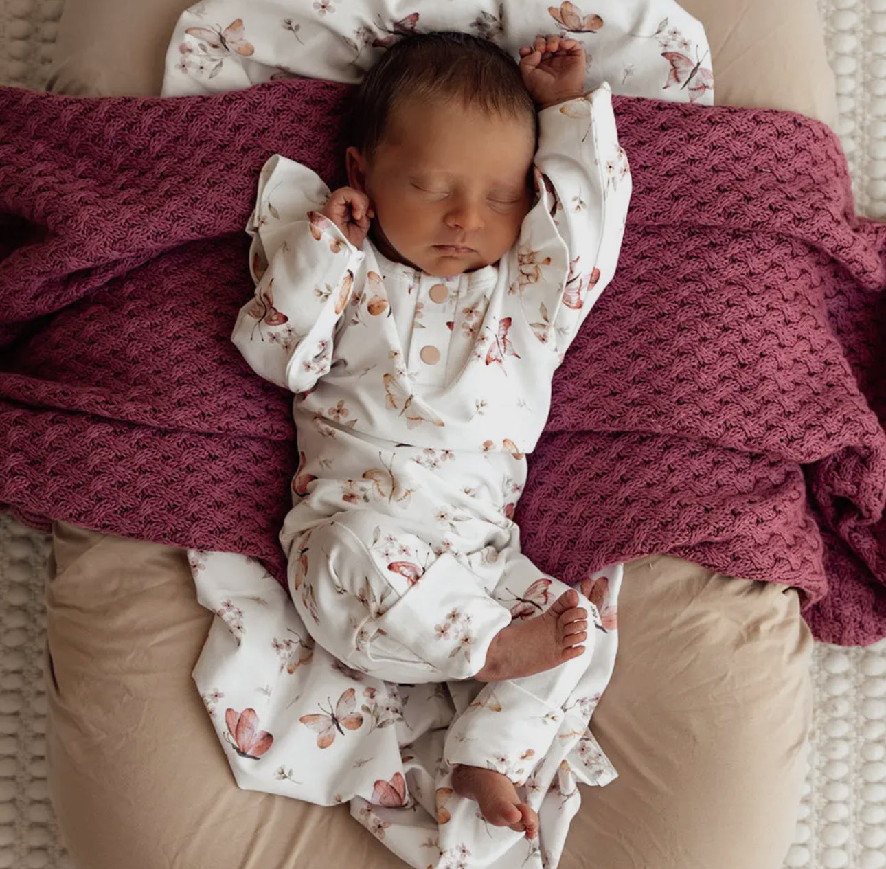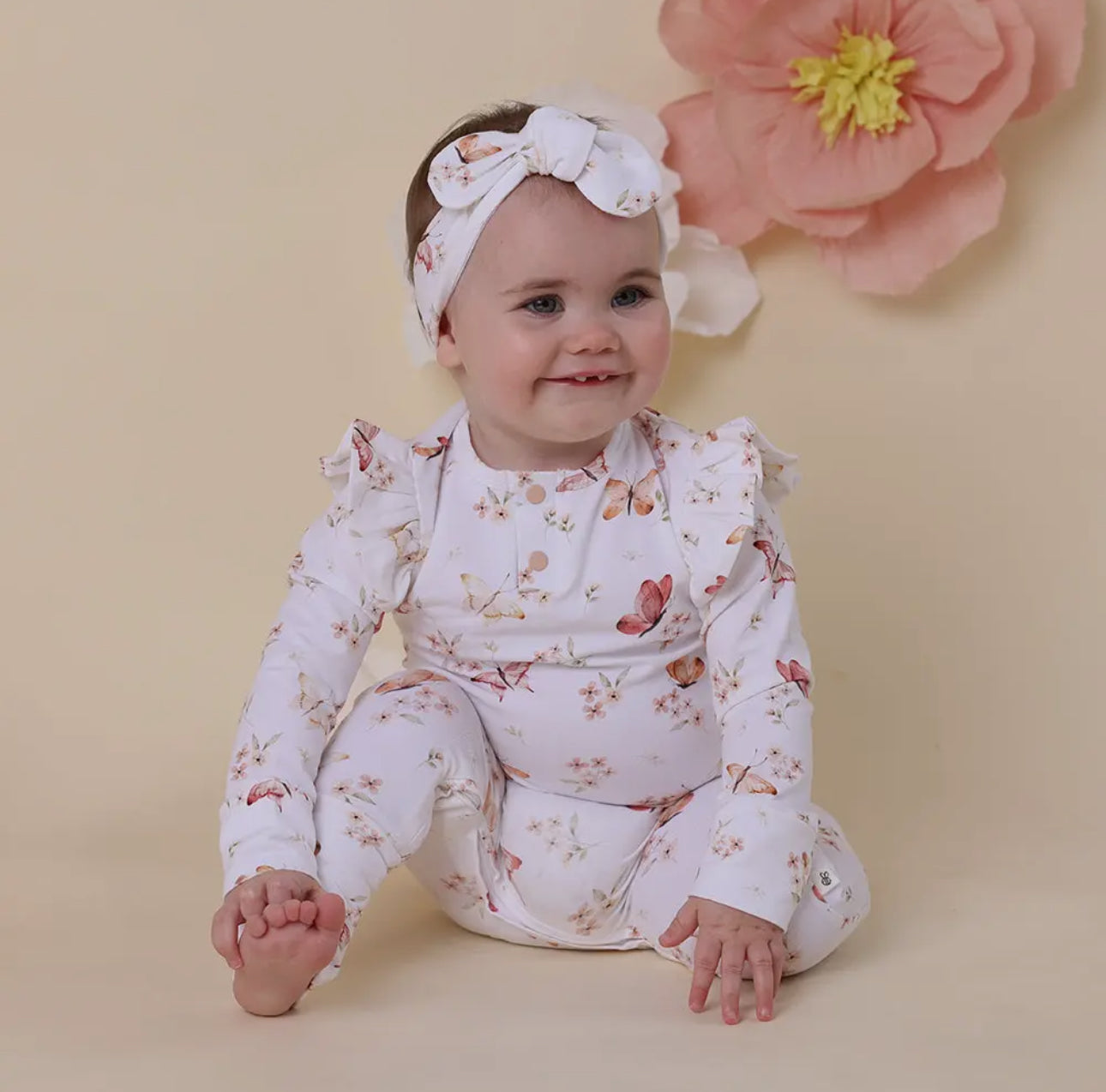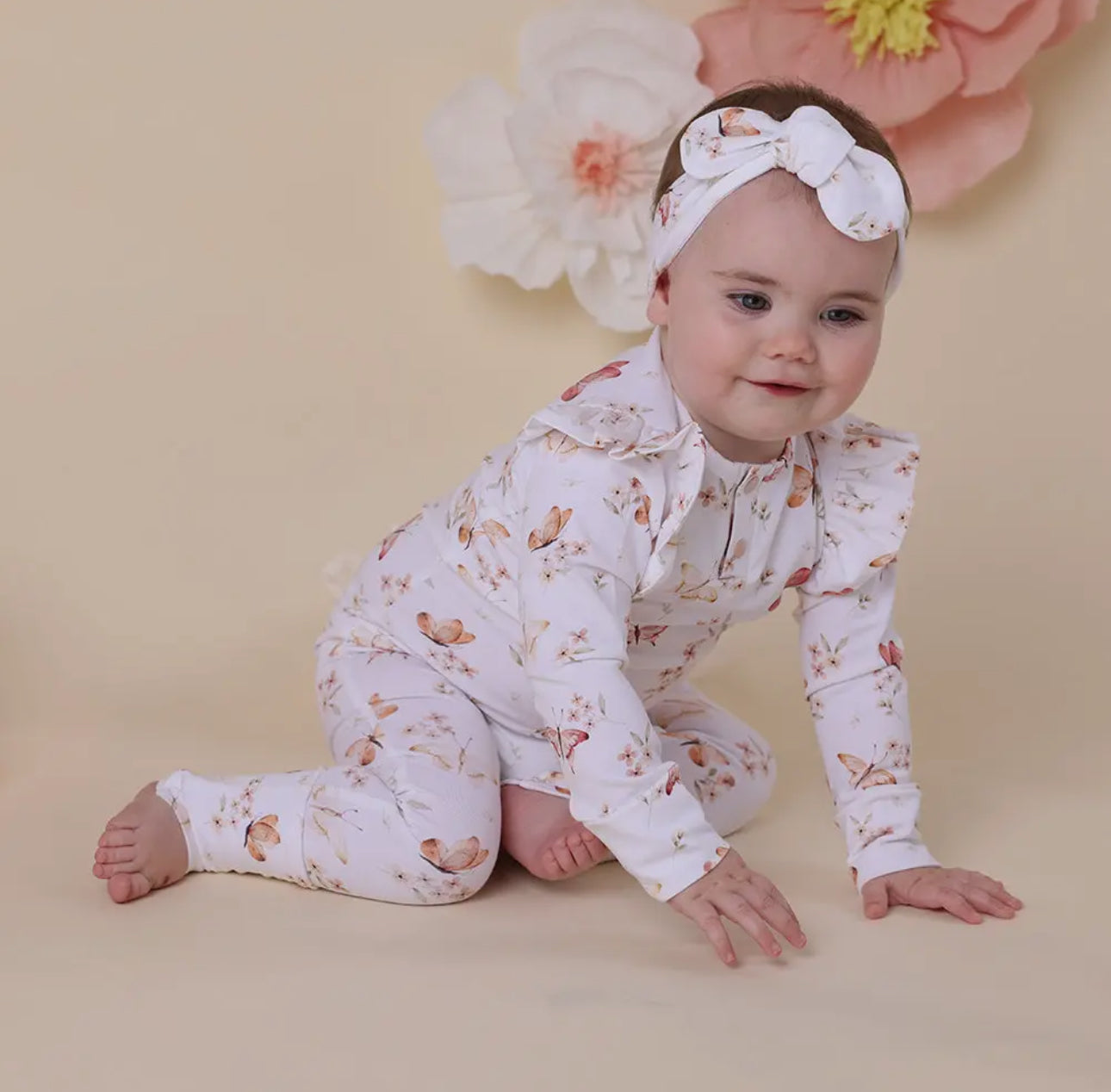 Our Butterfly growsuit comes with beautiful frills on the shoulders. We have also included foldable hand mittens for newborn to 6 months. Hand mittens help stop little nails from scratching and also keep hands warm when the weather is cool. Bub can wear the mittens open or closed. For sizes from 6 months upwards, the mittens are replaced with a stylish cuff. Foot mittens are also an important feature and these are included on all sizes. Who doesn’t love to tuck in those little feet for bedtime to keep warm?