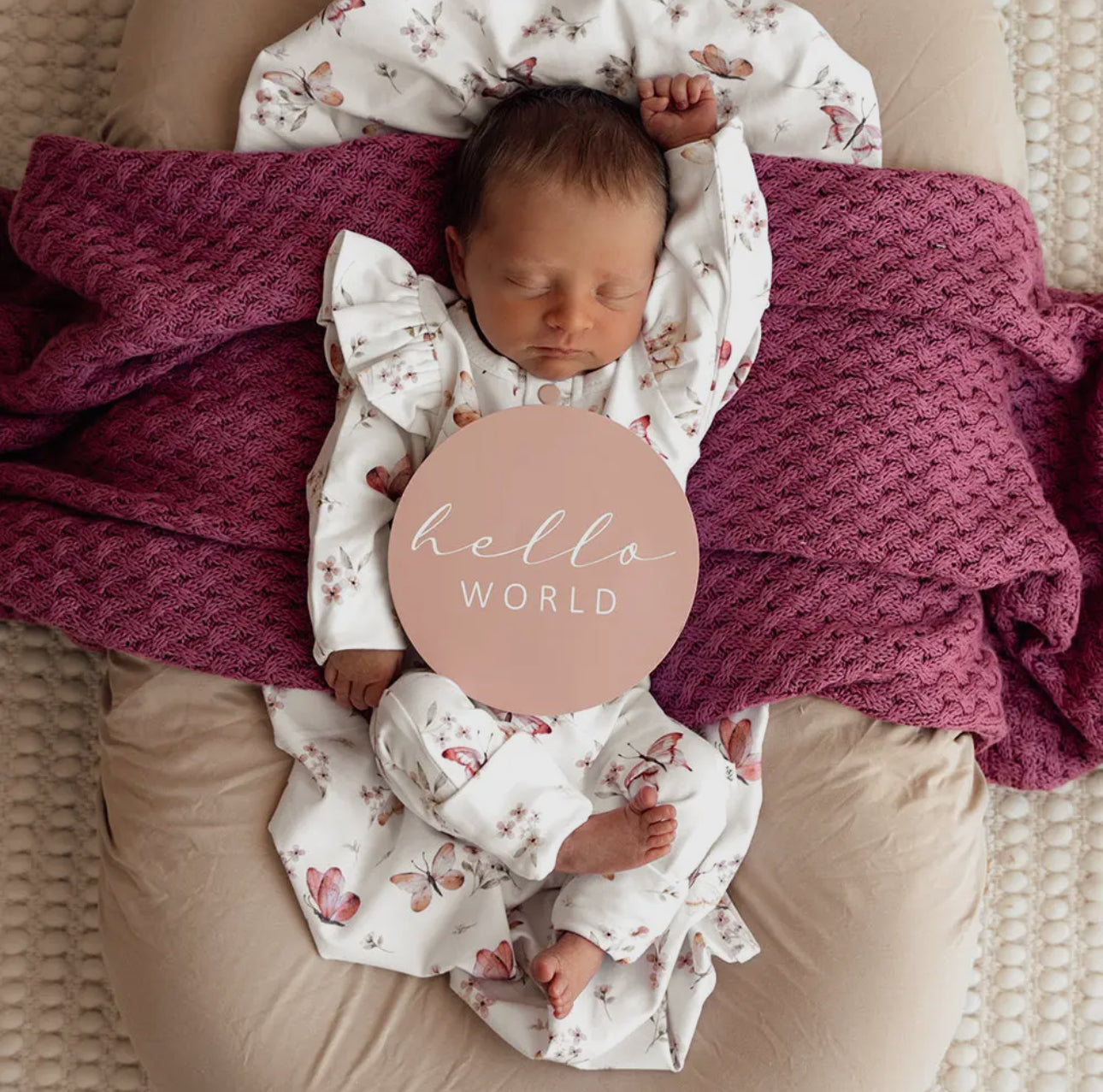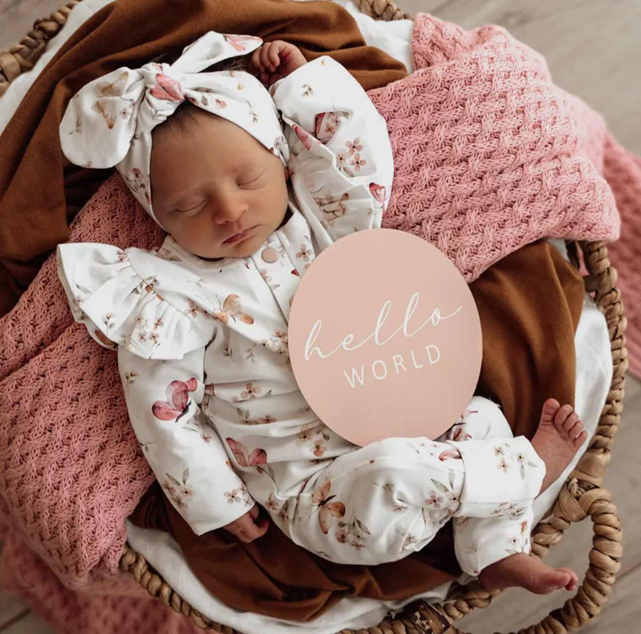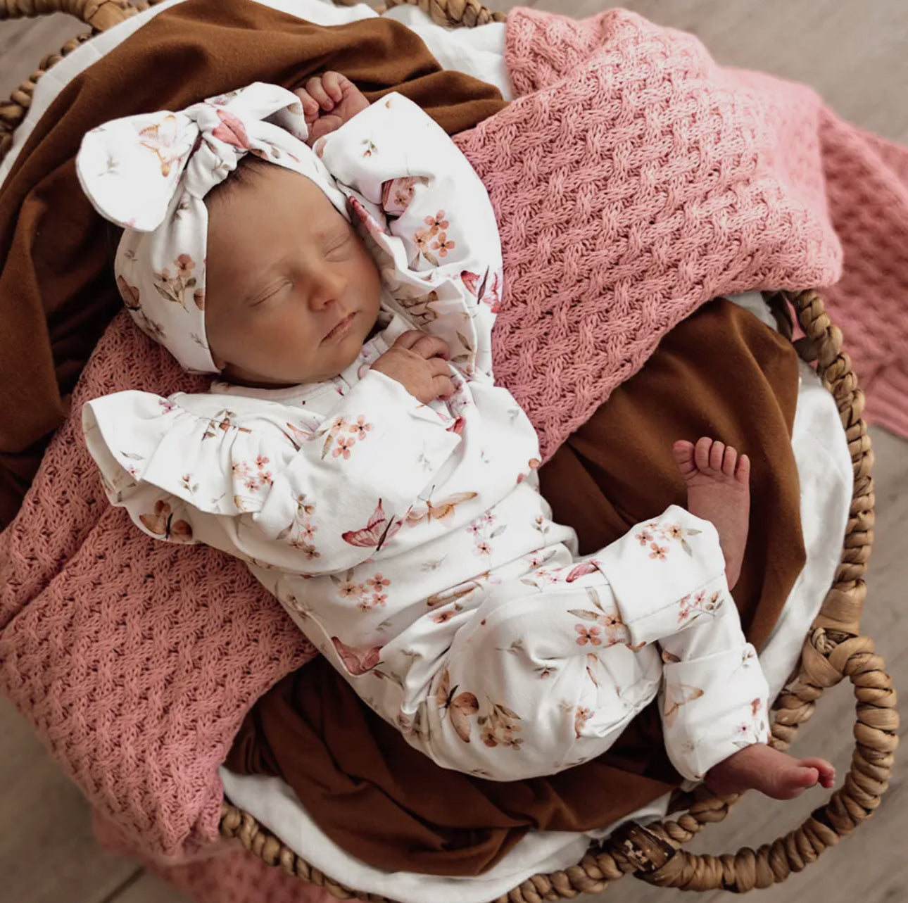 Our Butterfly growsuit comes with beautiful frills on the shoulders. We have also included foldable hand mittens for newborn to 6 months. Hand mittens help stop little nails from scratching and also keep hands warm when the weather is cool. Bub can wear the mittens open or closed. For sizes from 6 months upwards, the mittens are replaced with a stylish cuff. Foot mittens are also an important feature and these are included on all sizes. Who doesn’t love to tuck in those little feet for bedtime to keep warm?