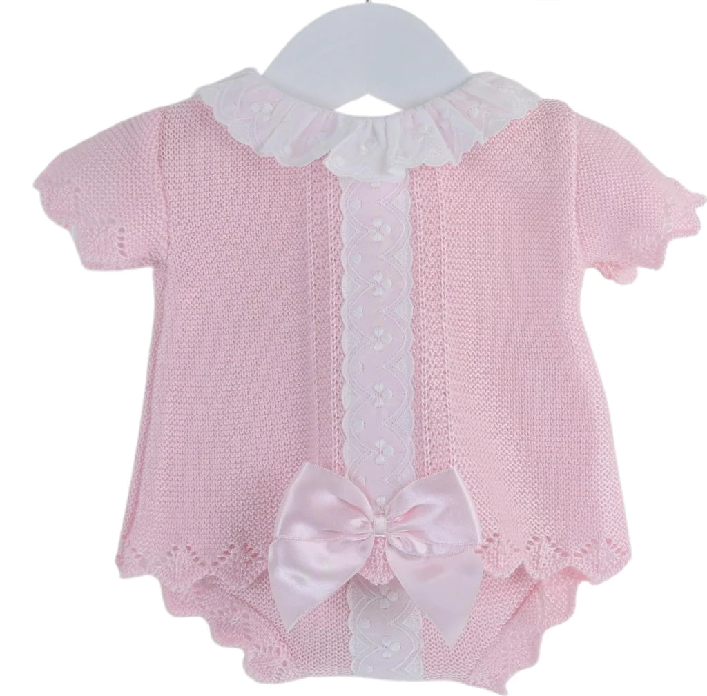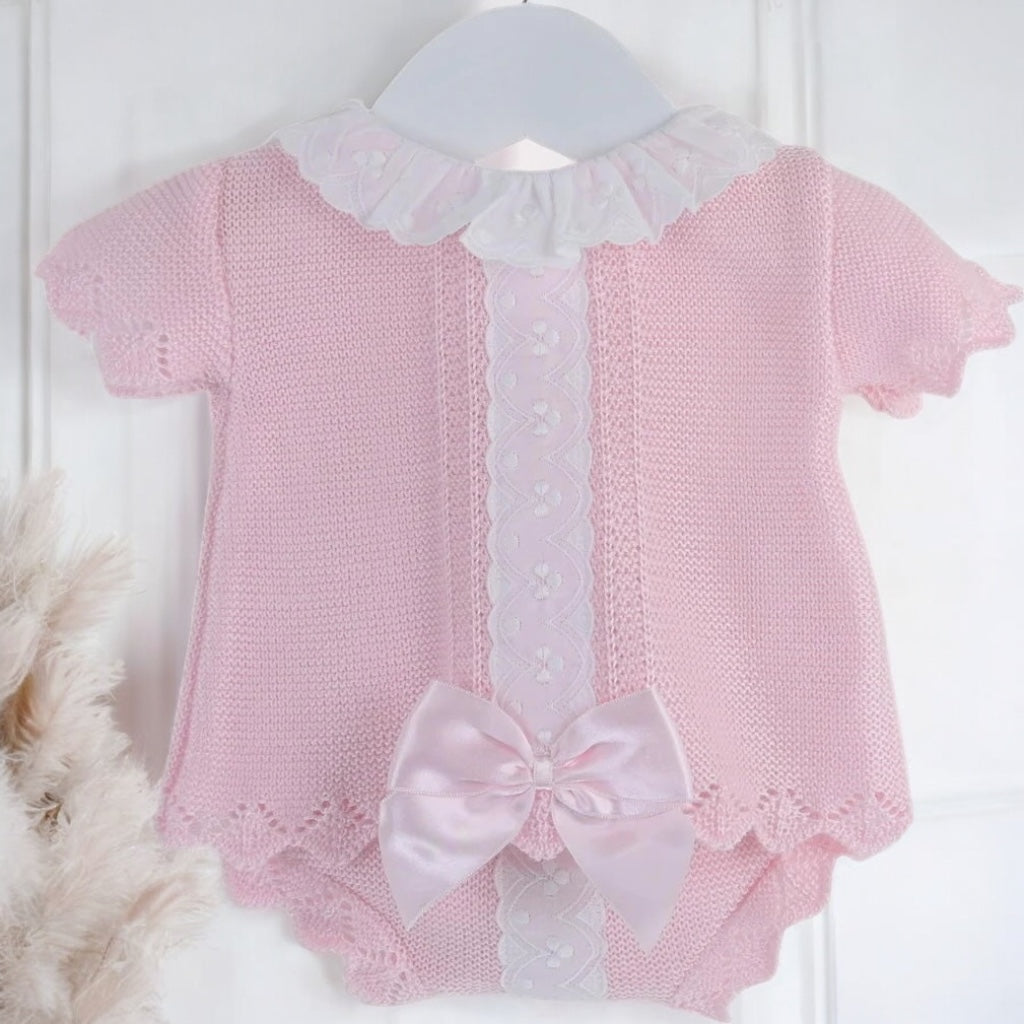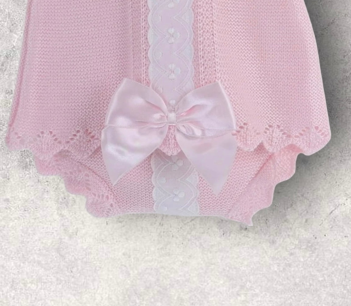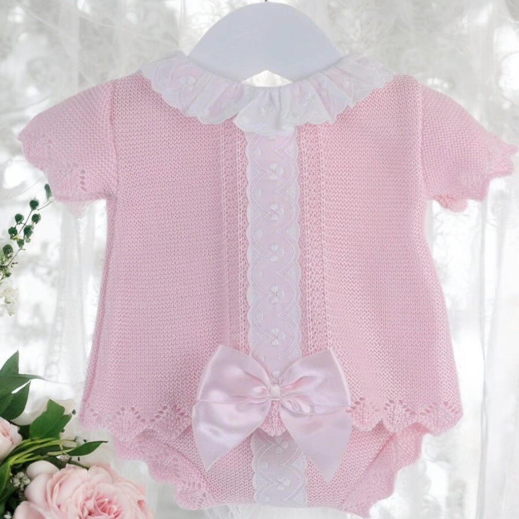 Crafted from a beautifully soft silk-feel pastel pink yarn, our stunning Clarissa outfit is comfortable and breathable. With a pretty white lace around the collar and running down the front, the top also includes a sumptuous pink ribbon bow towards the hem. With a super cute pair of knitted jam pants that feature a coordinating white lace panel.