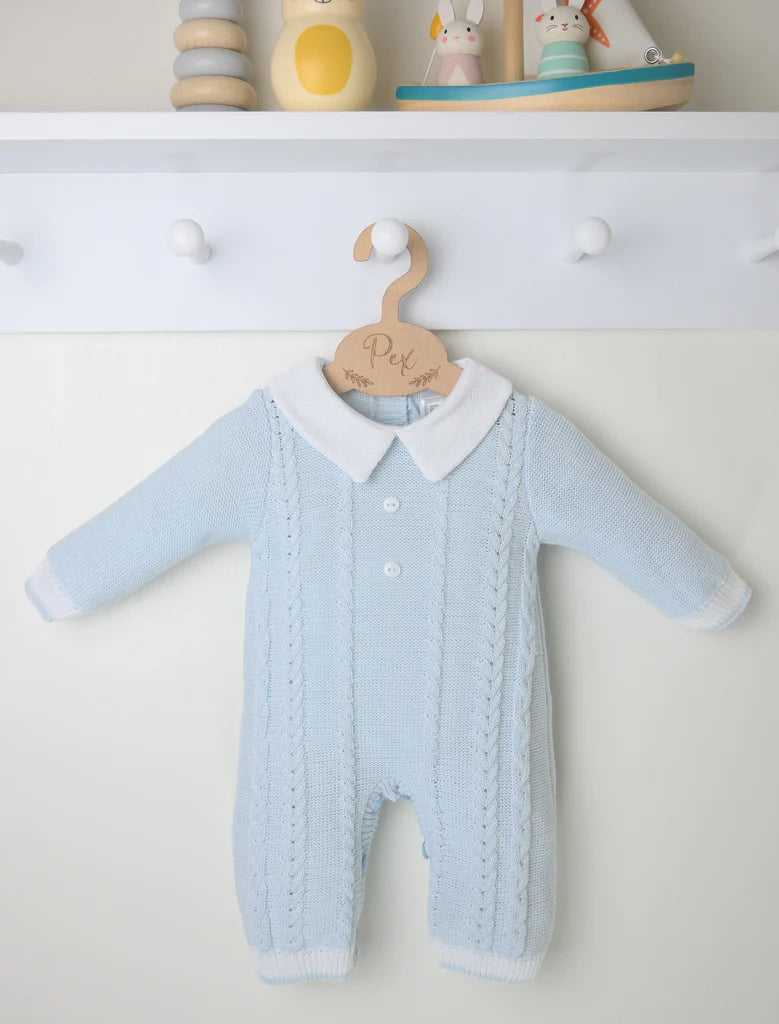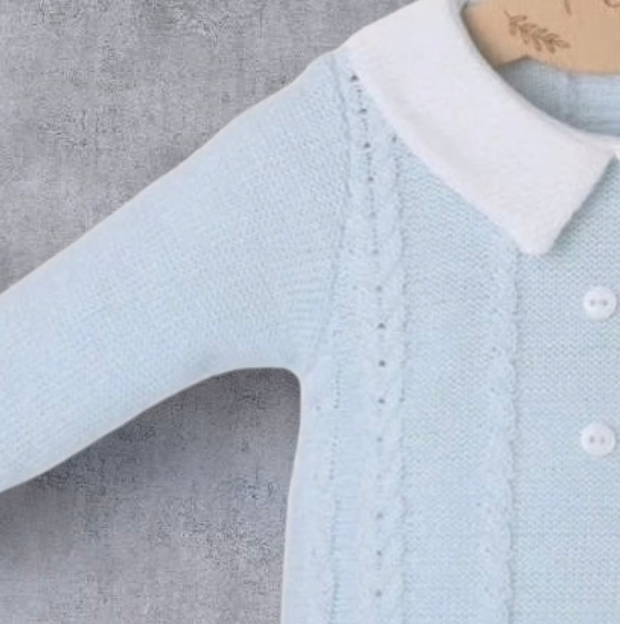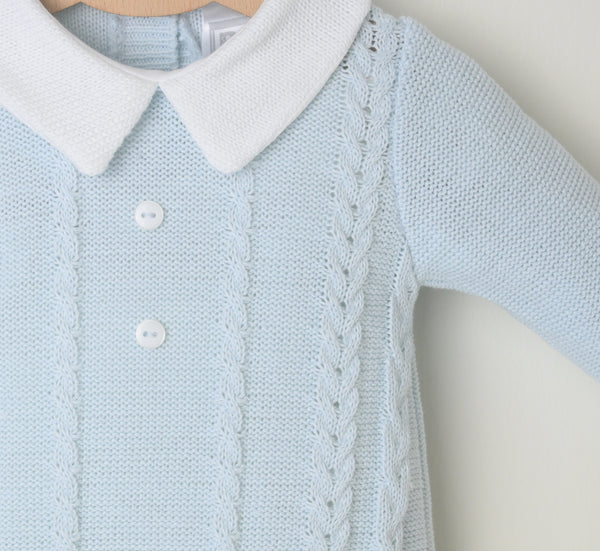 The most perfect baby boys pure cotton cable knit romper with contrast white opal buttons at the chest. Contrast white collar and stripes at the cuffs and hem. three button opening at the rear neck and between the legs for ease of changing.