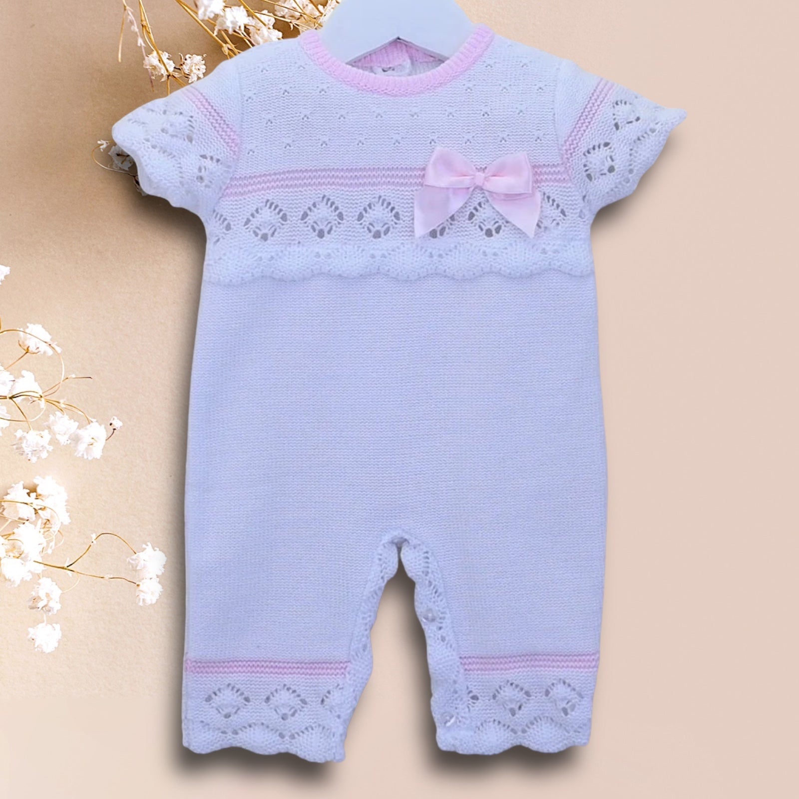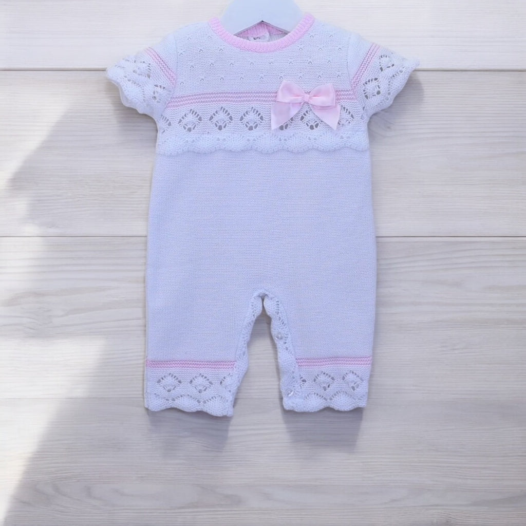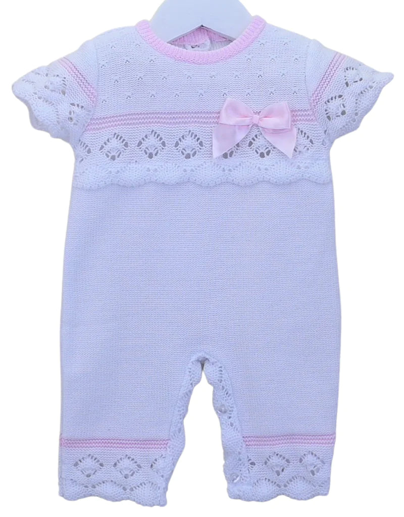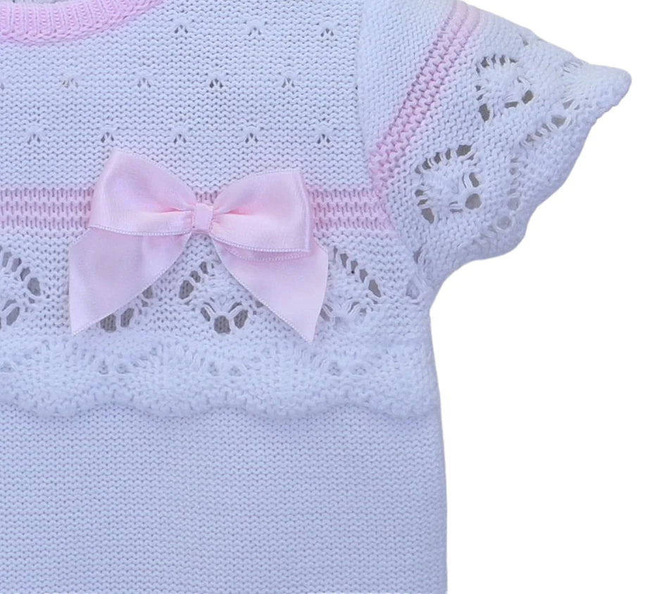 Knitted in wonderful 100% pure cotton this lovely little romper is full of adorable charm. Textured knits with contrast pink detailing and a pretty ribbon bow.
