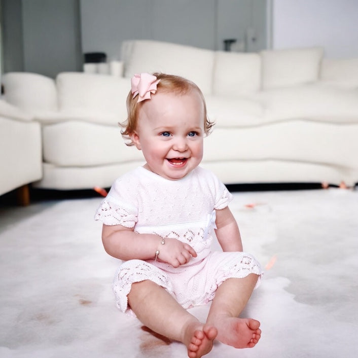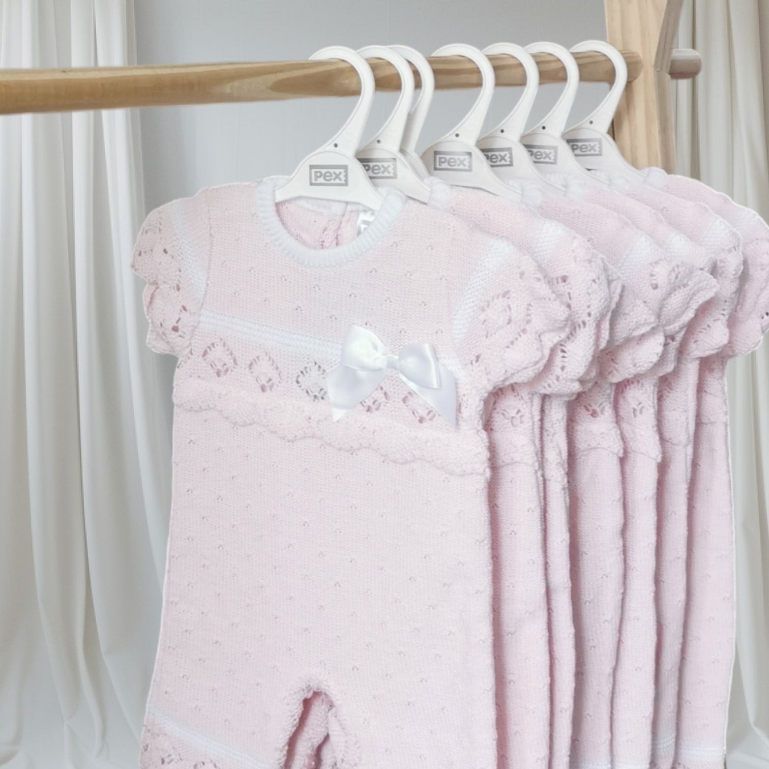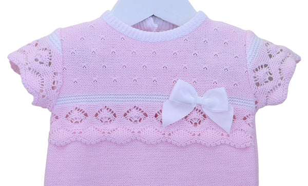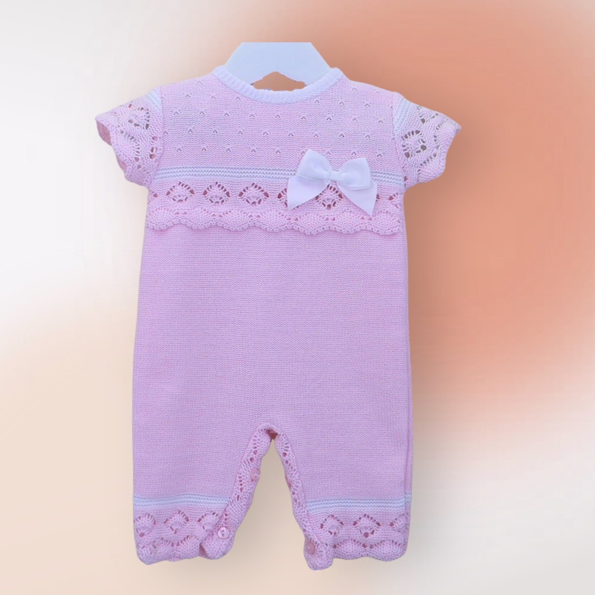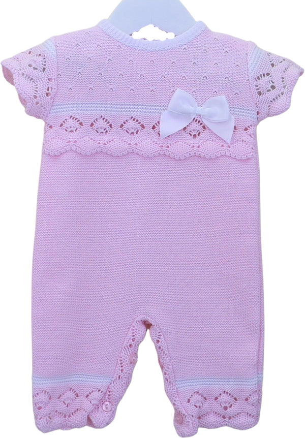 Knitted in wonderful 100% pure cotton this lovely little romper is full of adorable charm. Textured knits with contrast white detailing and a pretty ribbon bow.