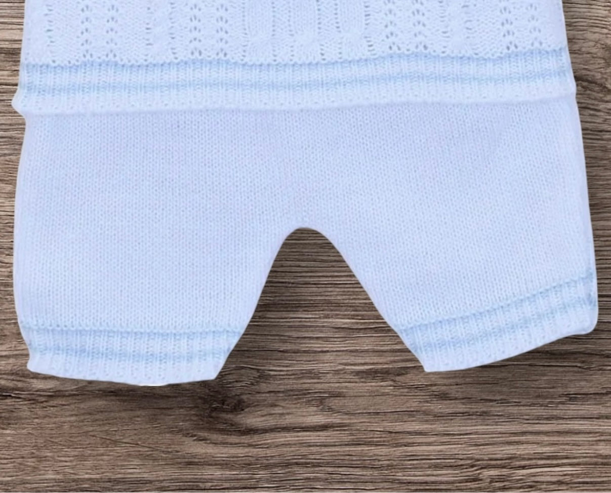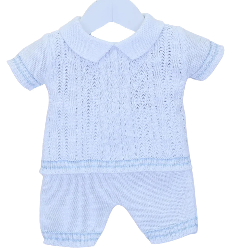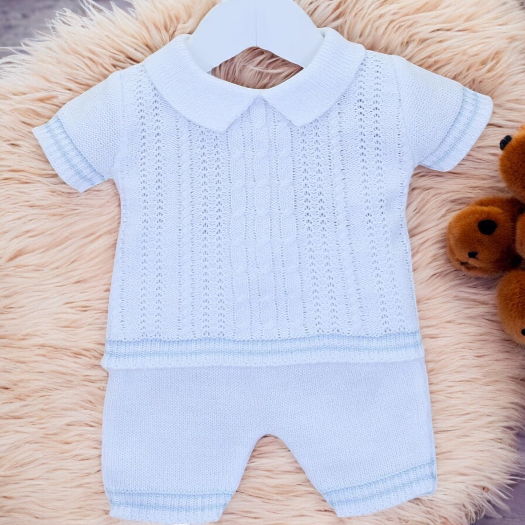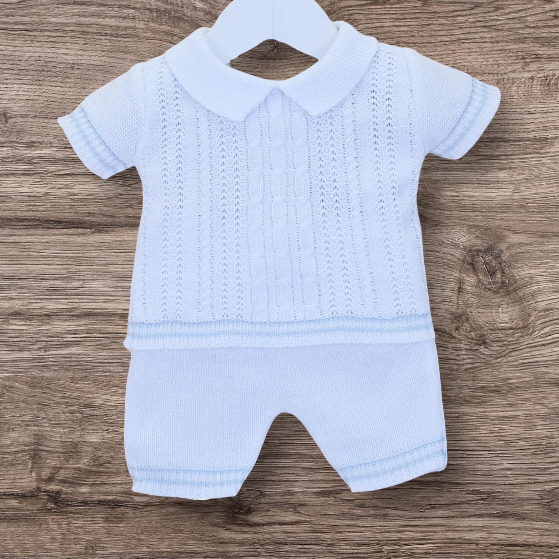 A charming little two-piece suit made in wonderful 100% cotton. Smart textured knits and contrast stripes. The perfect little outfit for any occasion.