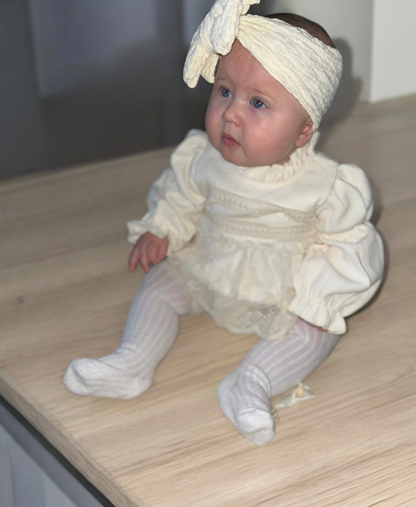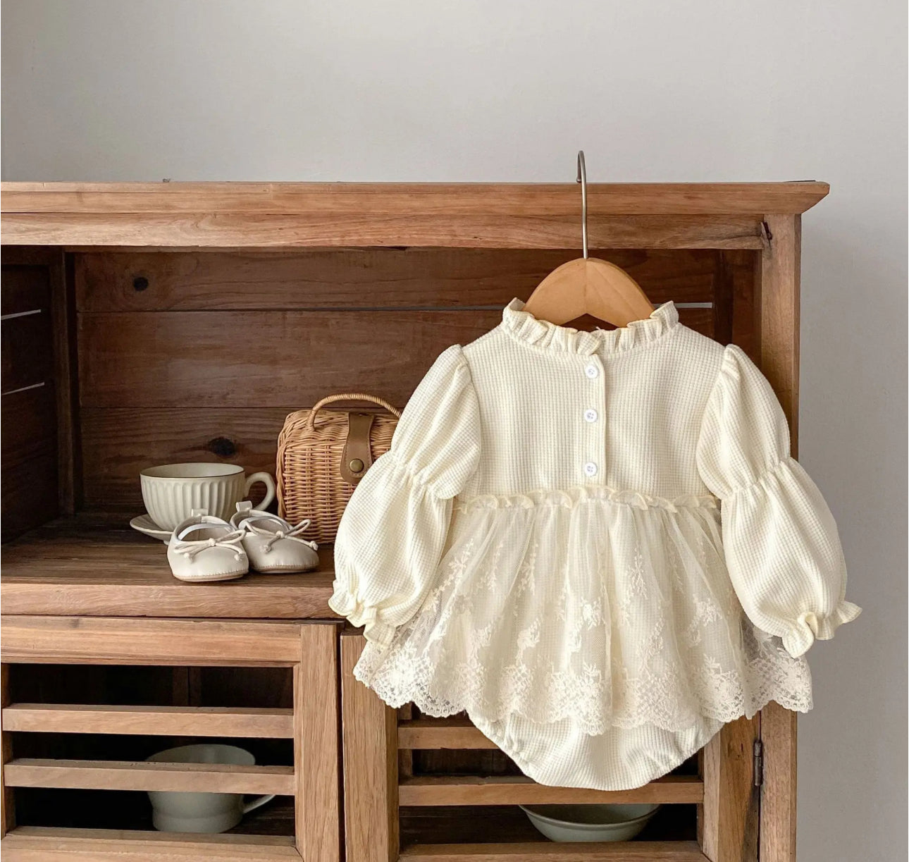 Stunning baby girls romper with lace detailing and waffle bodysuit. A cute ruffle collar gives this adorable romper a classic look.