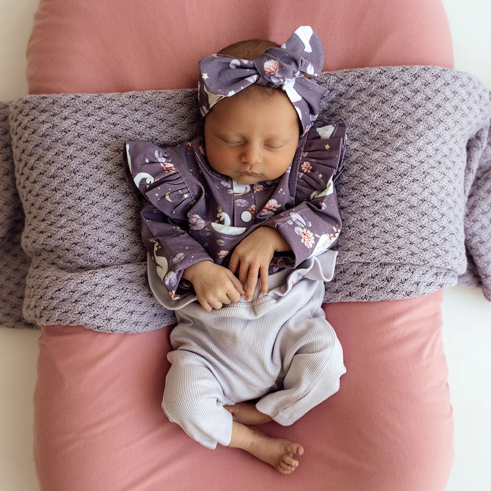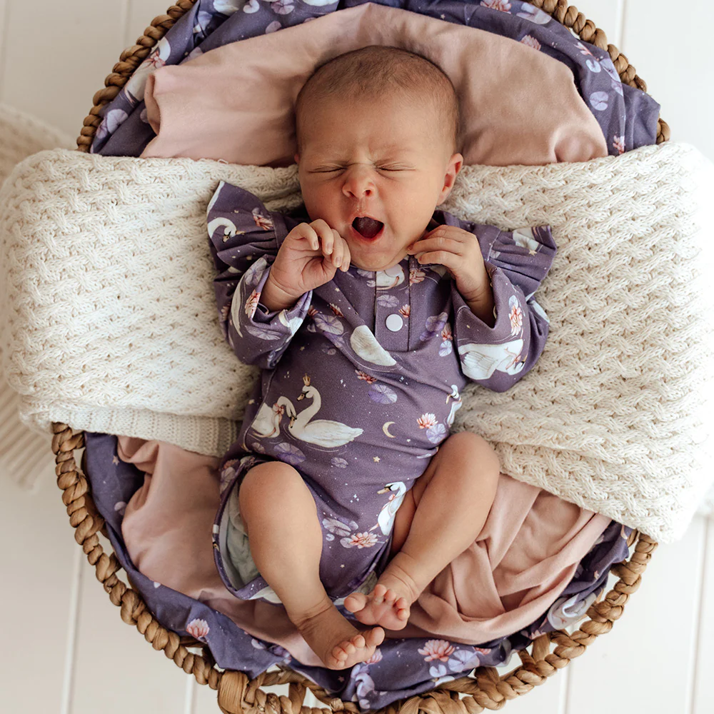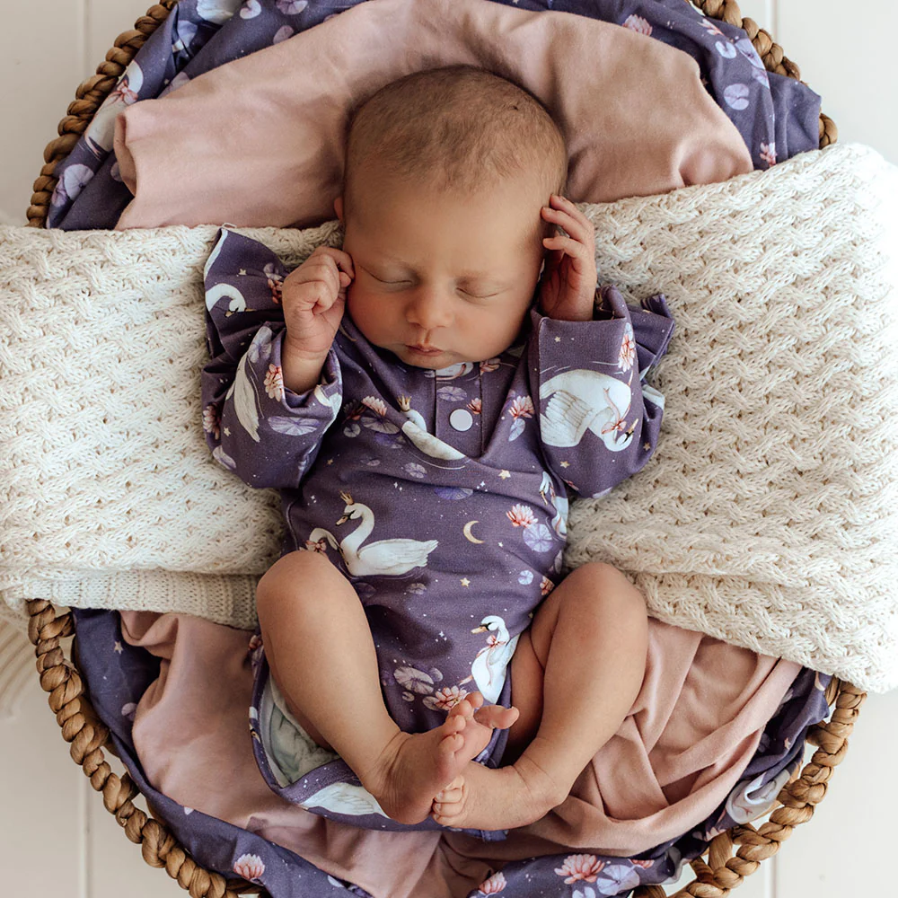 Snuggle Hunny organic bodysuits are made for babies and toddlers and our exclusive Midnight Swan print is bold, bright and beautiful. This bodysuit is long-sleeved, and great for cooler days in Summer and Winter under layers.