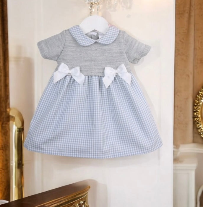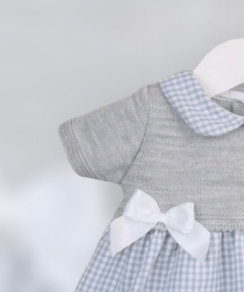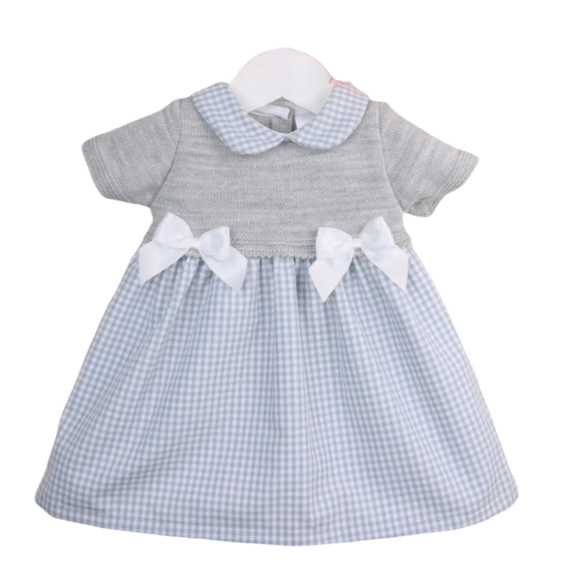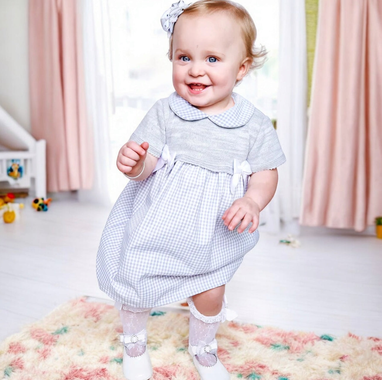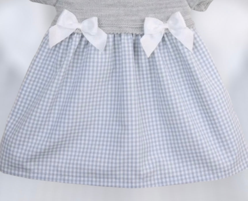 Our lovely Mila dress is a super soft knitted bodice with a lovely gingham lined skirt. It comes in sophisticated silver grey and is finished off with two pretty bows at the waist.