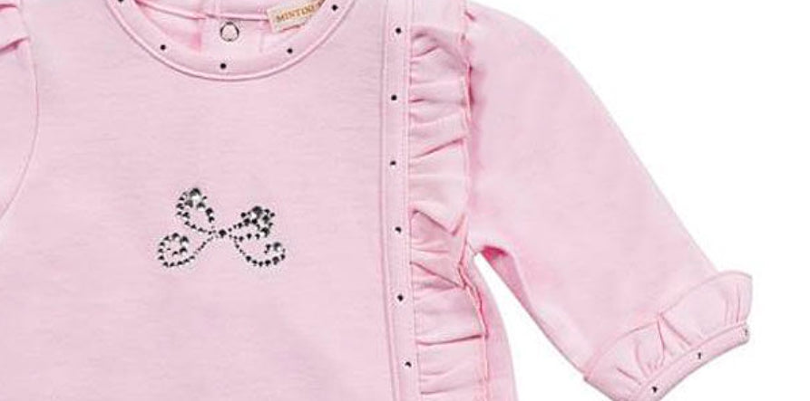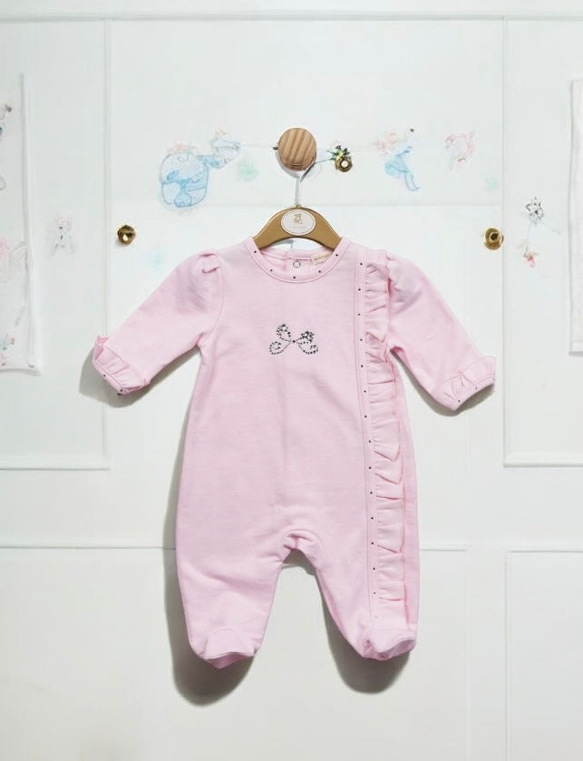 Delightful little baby-grow with a touch of sparkle. The perfect little one piece with diamanté bow, frill neckline & cuff. Let your little darling shine.