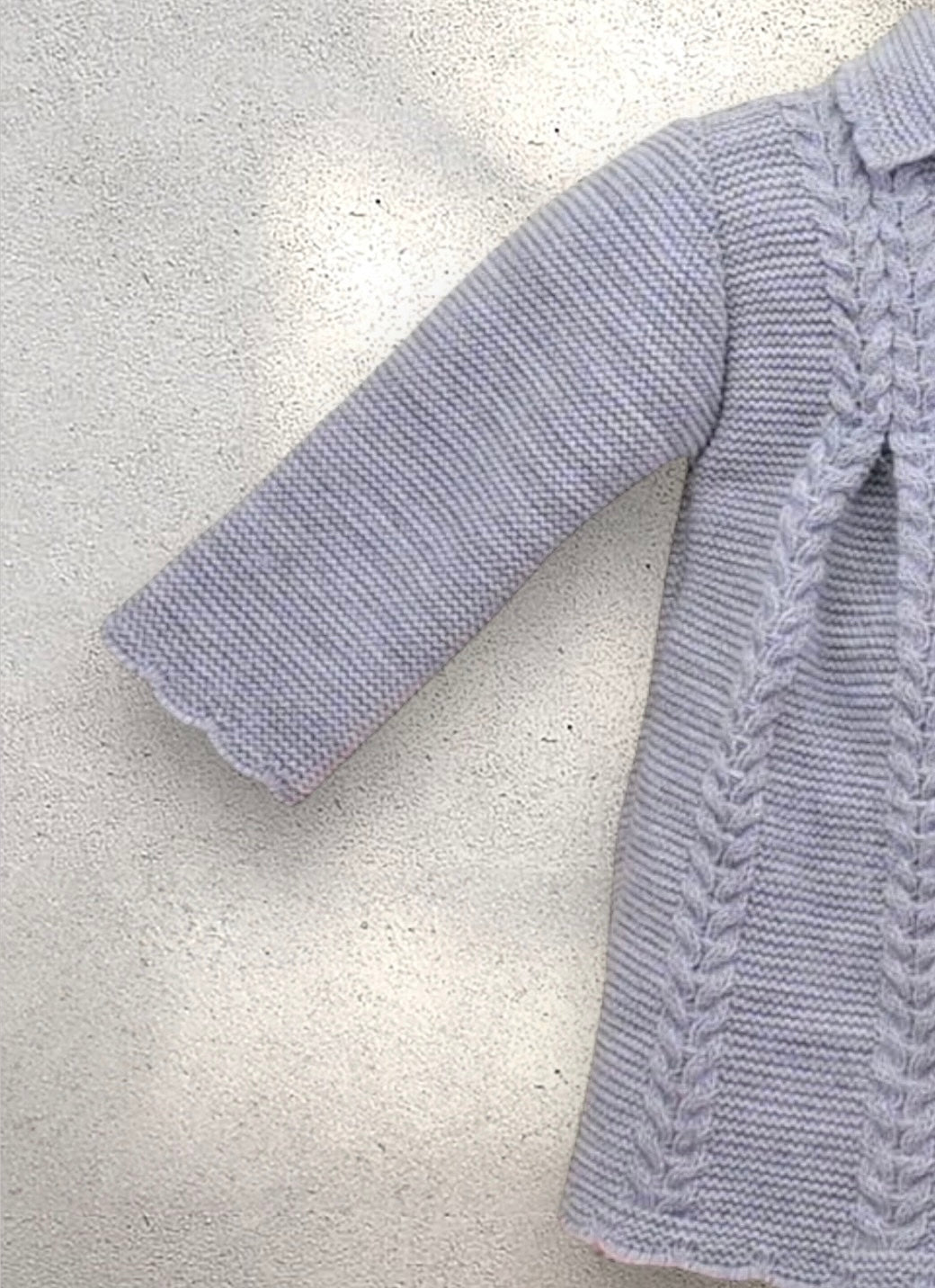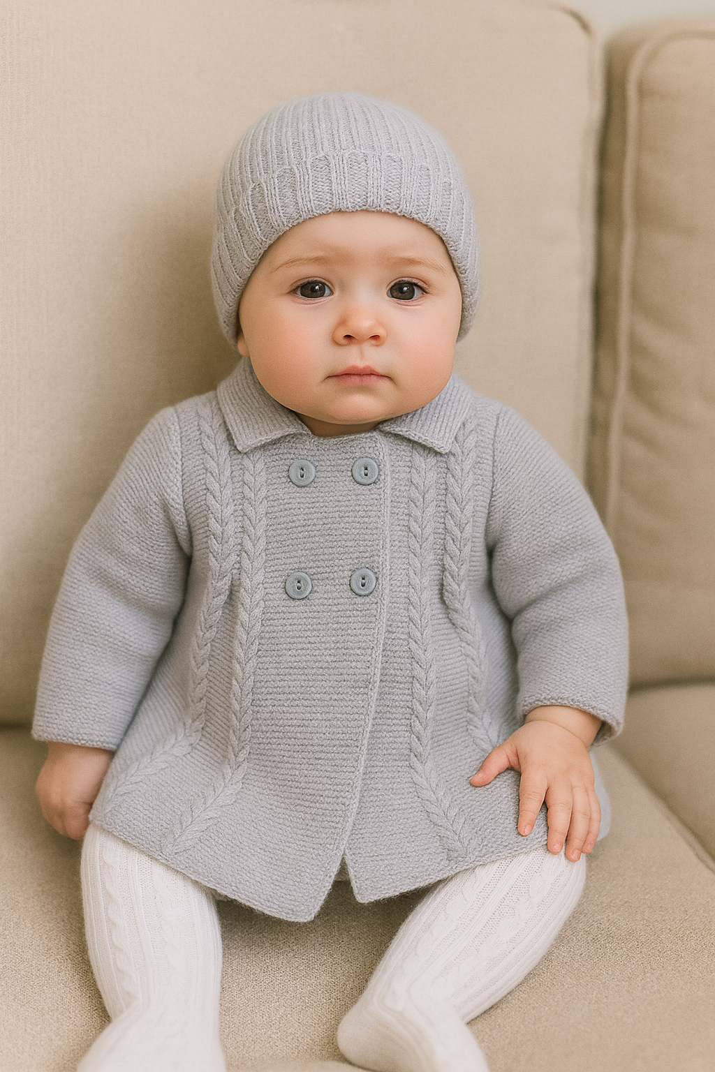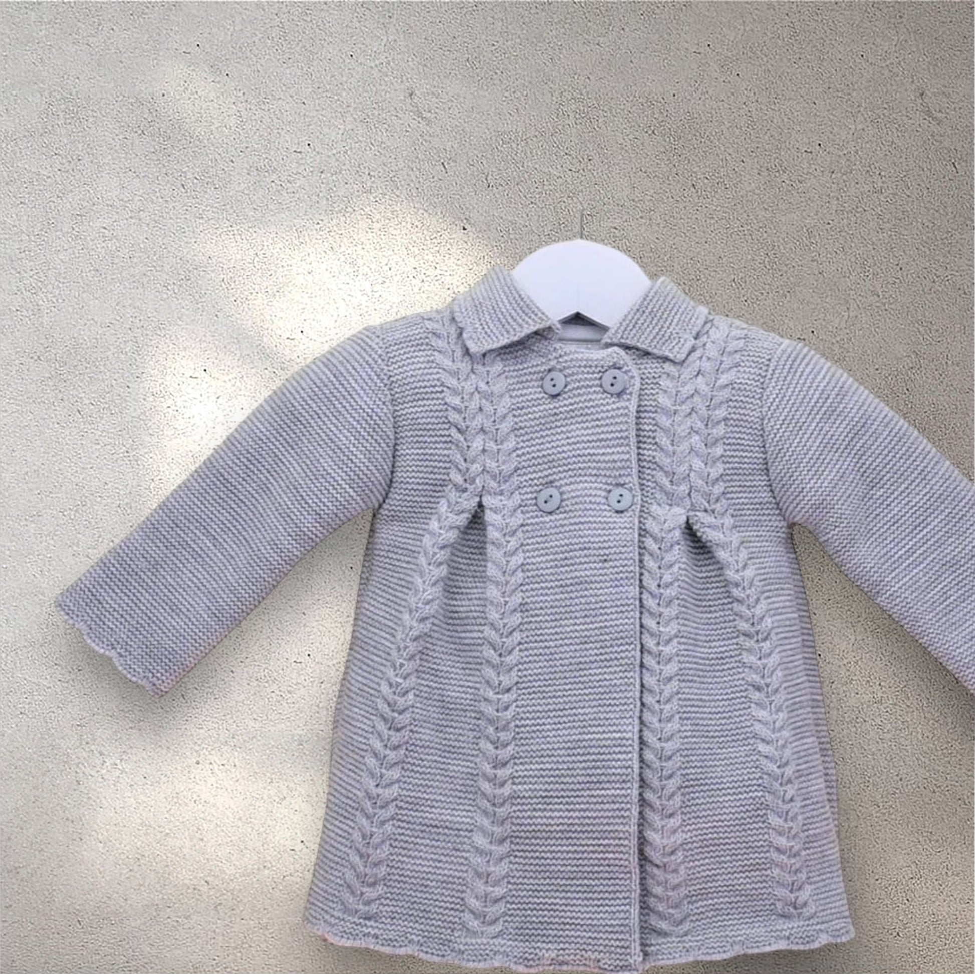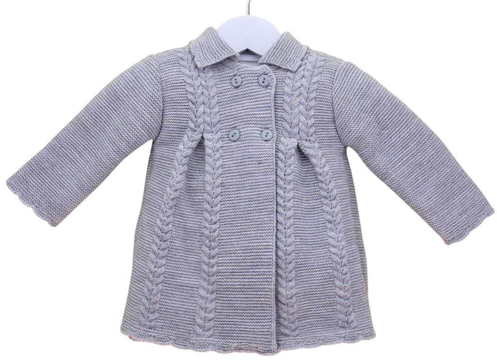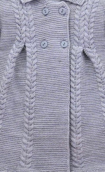Stunning vintage style baby girls silver grey coat. This wonderful little coat has a double breasted button front. The smart cable knit striped knit design pleats at the front and back show beautiful detail to this little coat.