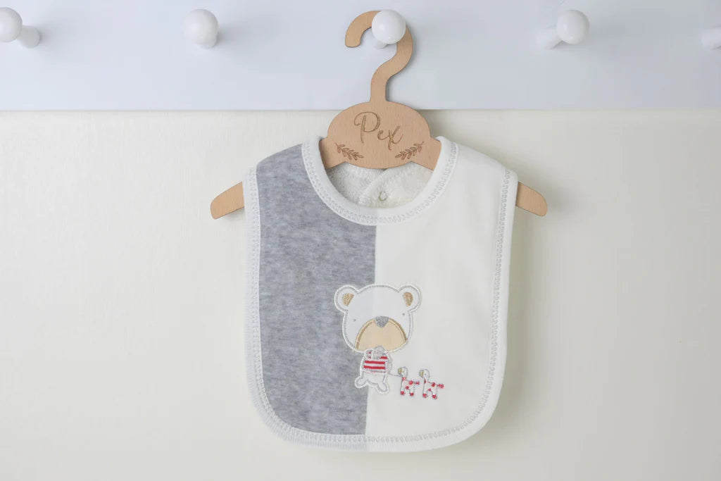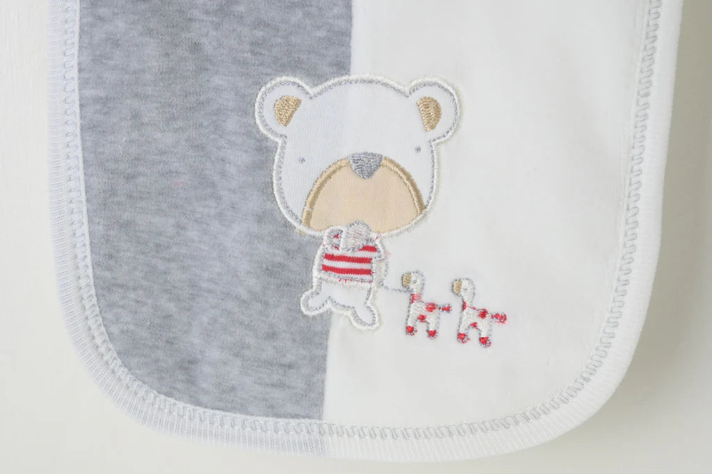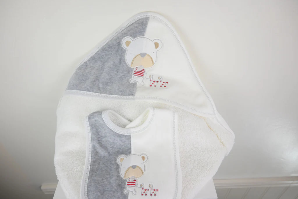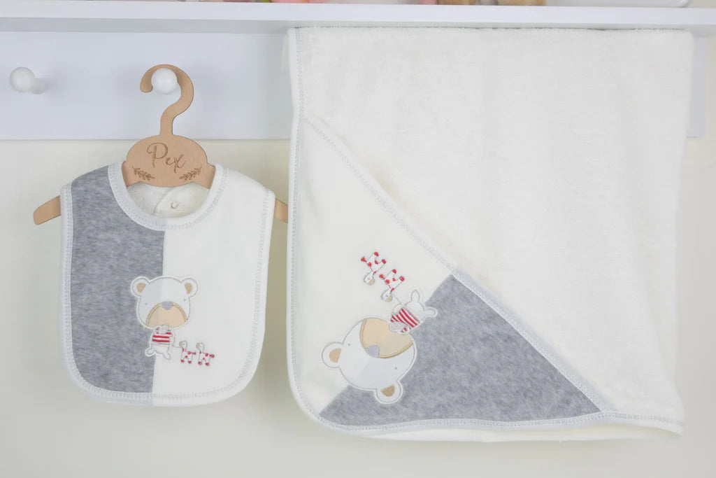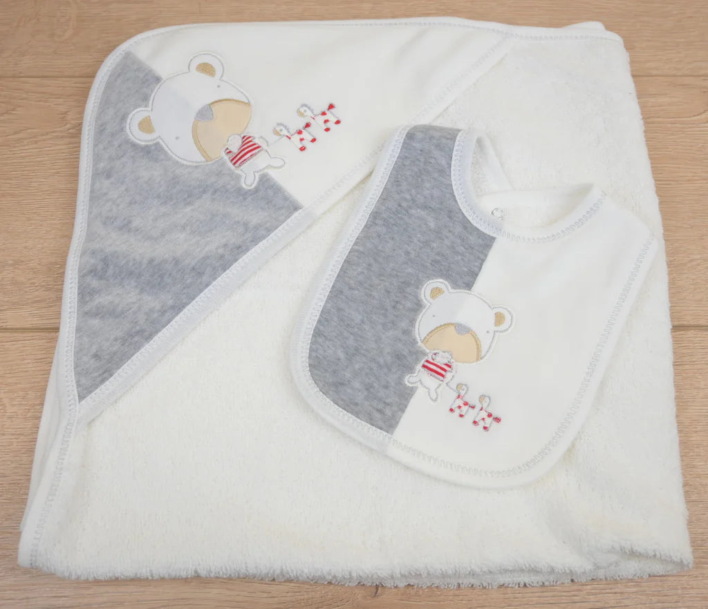 Adorable pure cotton velour hooded towel with cute toys embroidery. the towel has piped edging and comes with a cotton velour bib with a popper fastening. The towel measures 75cm x 75cm. Matching baby-grow available.
