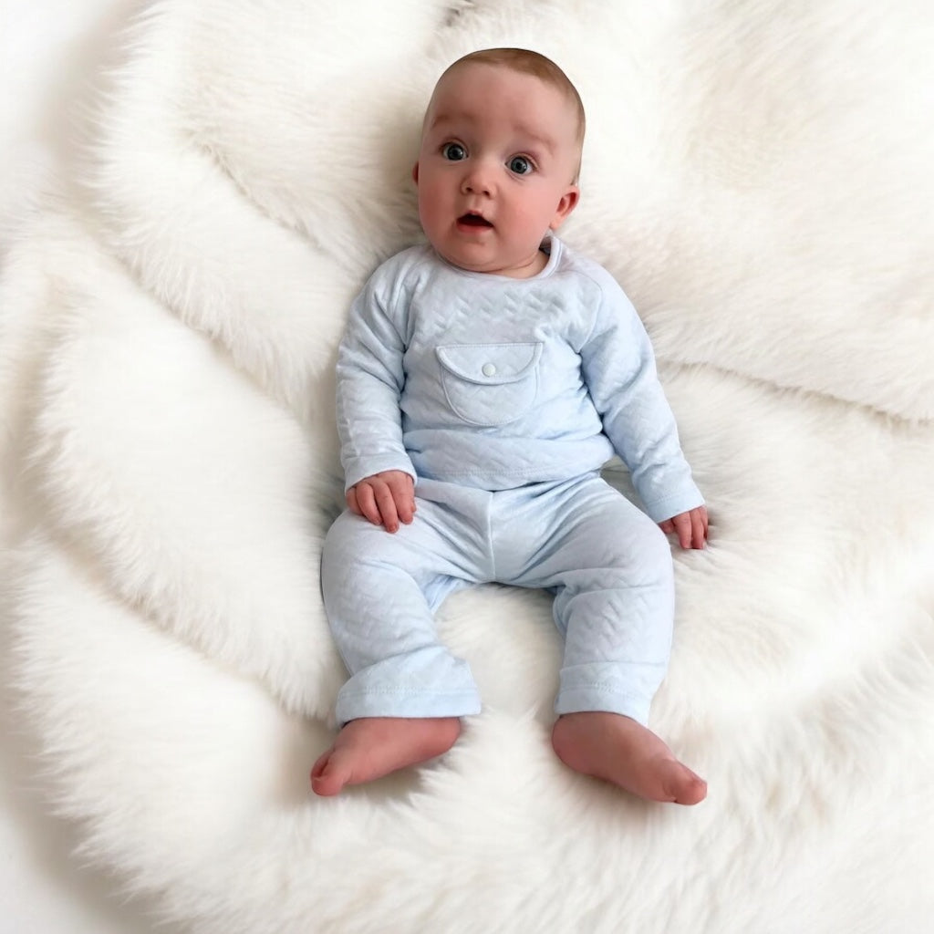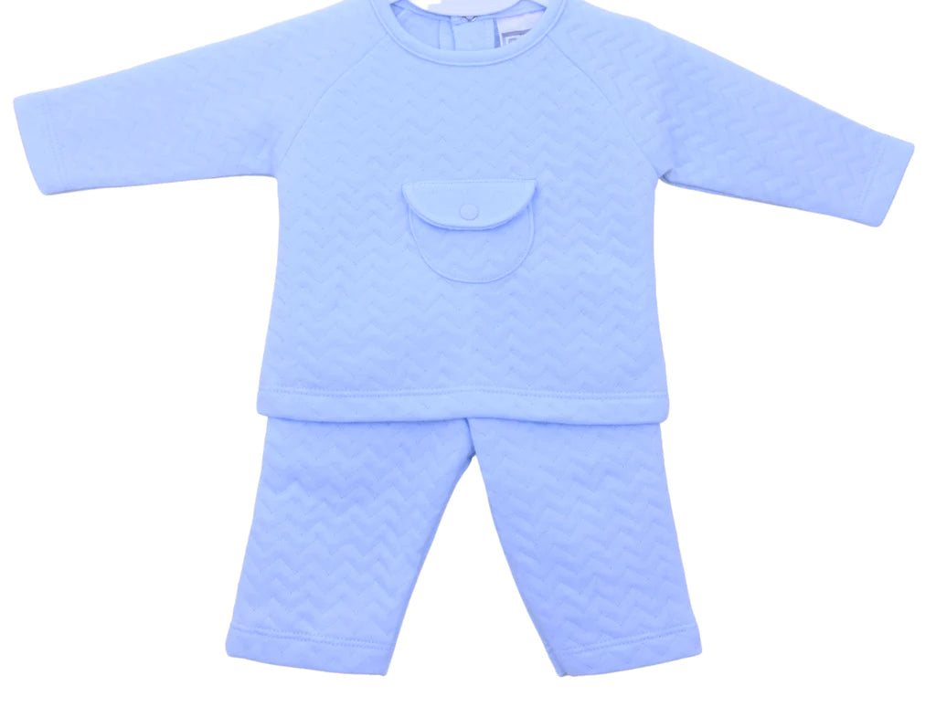 An elegant little two-piece made in pale blue quilted cotton. The top is casual yet stylish with a pocket that has a press stud fastening. The matching little trousers are comfortably elasticated at the waist and are again in wonderfully comfy, soft cotton.