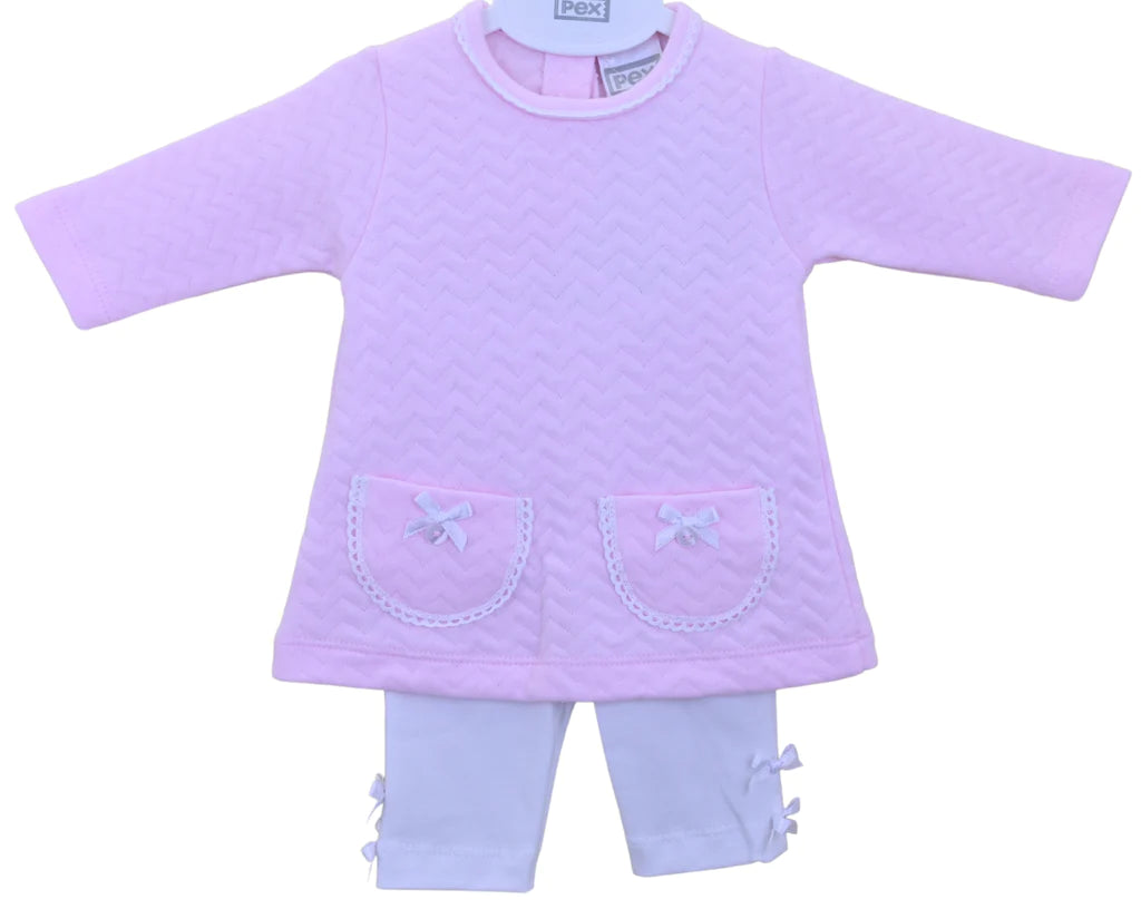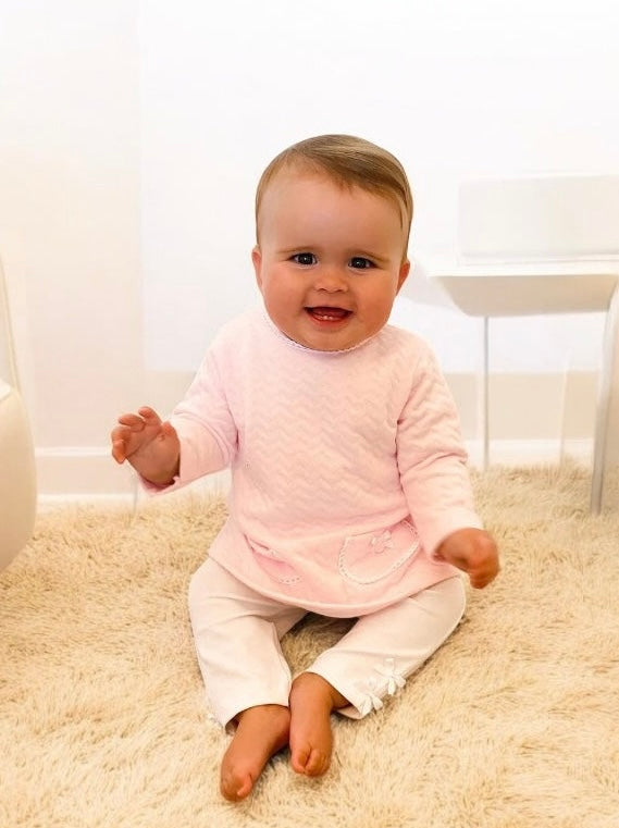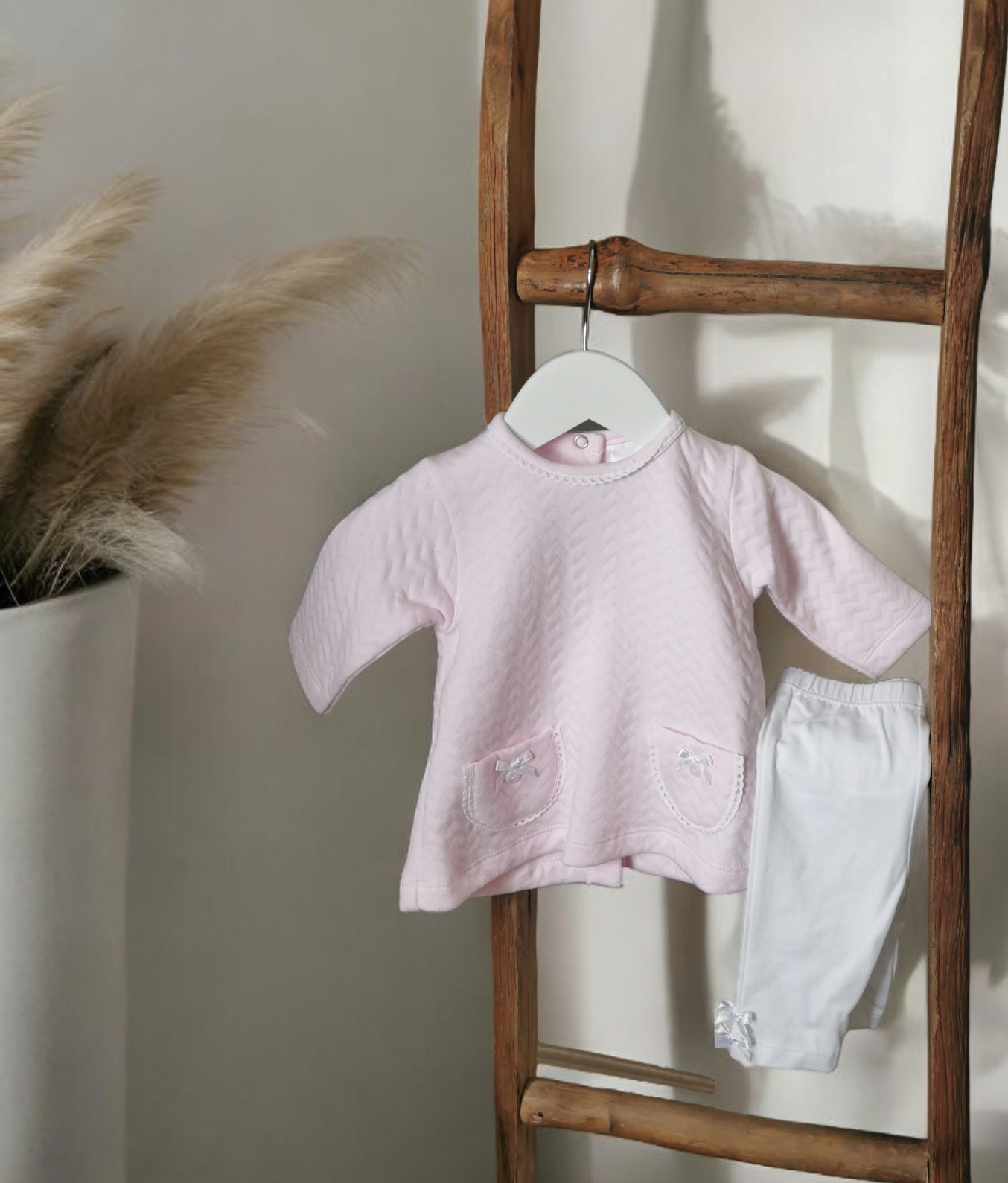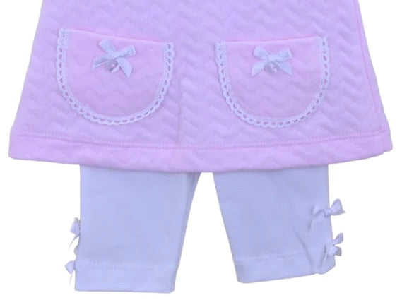 This lovely 2 piece outfit features an adorable tunic dress with the prettiest little appliqued pockets along with convenient press studs running down the back. Complete with a smart pair of pure white leggings that feature dainty bows towards the feet. Pure cotton that offers skin kind benefits and ease of care.
