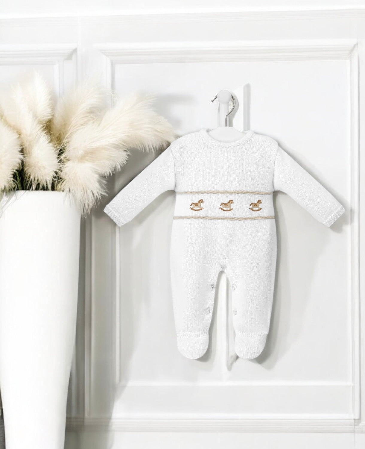 Adorable knitted unisex onesie from Dandelion with cute little rocking horse applique on the front. Perfectly cosy and adorably stylish for your little one’s wardrobe.