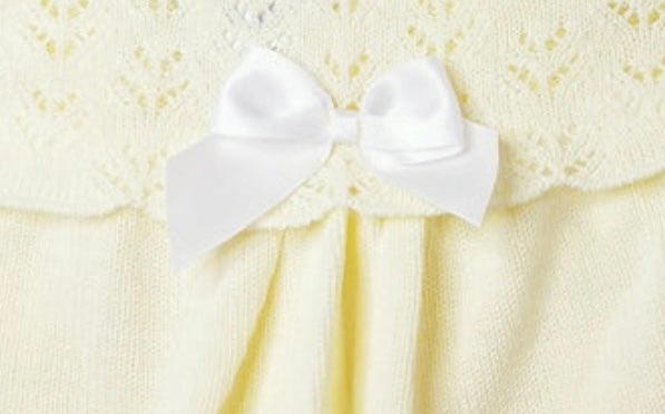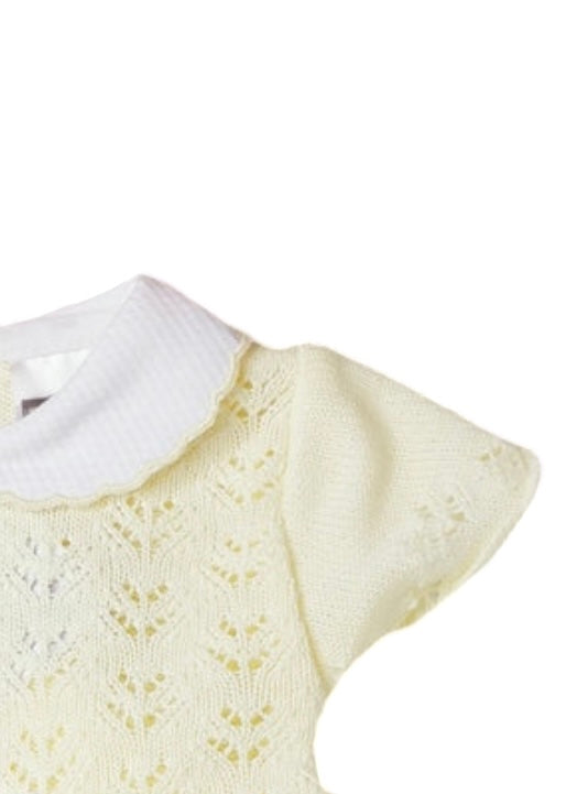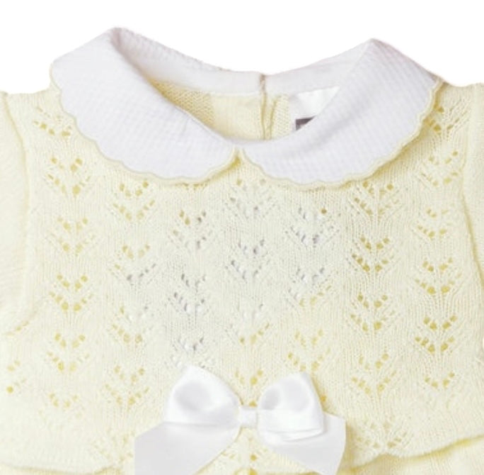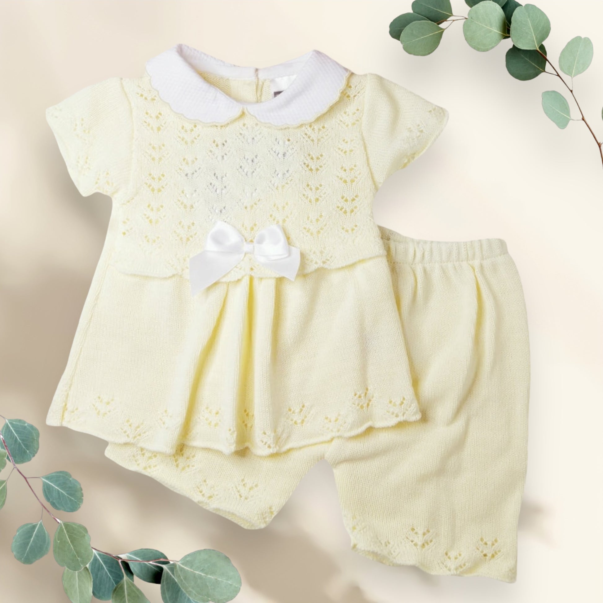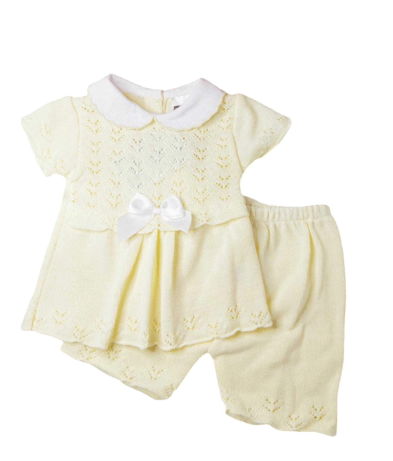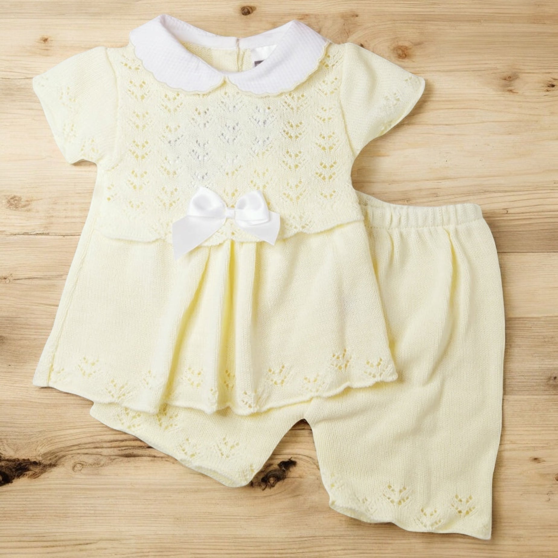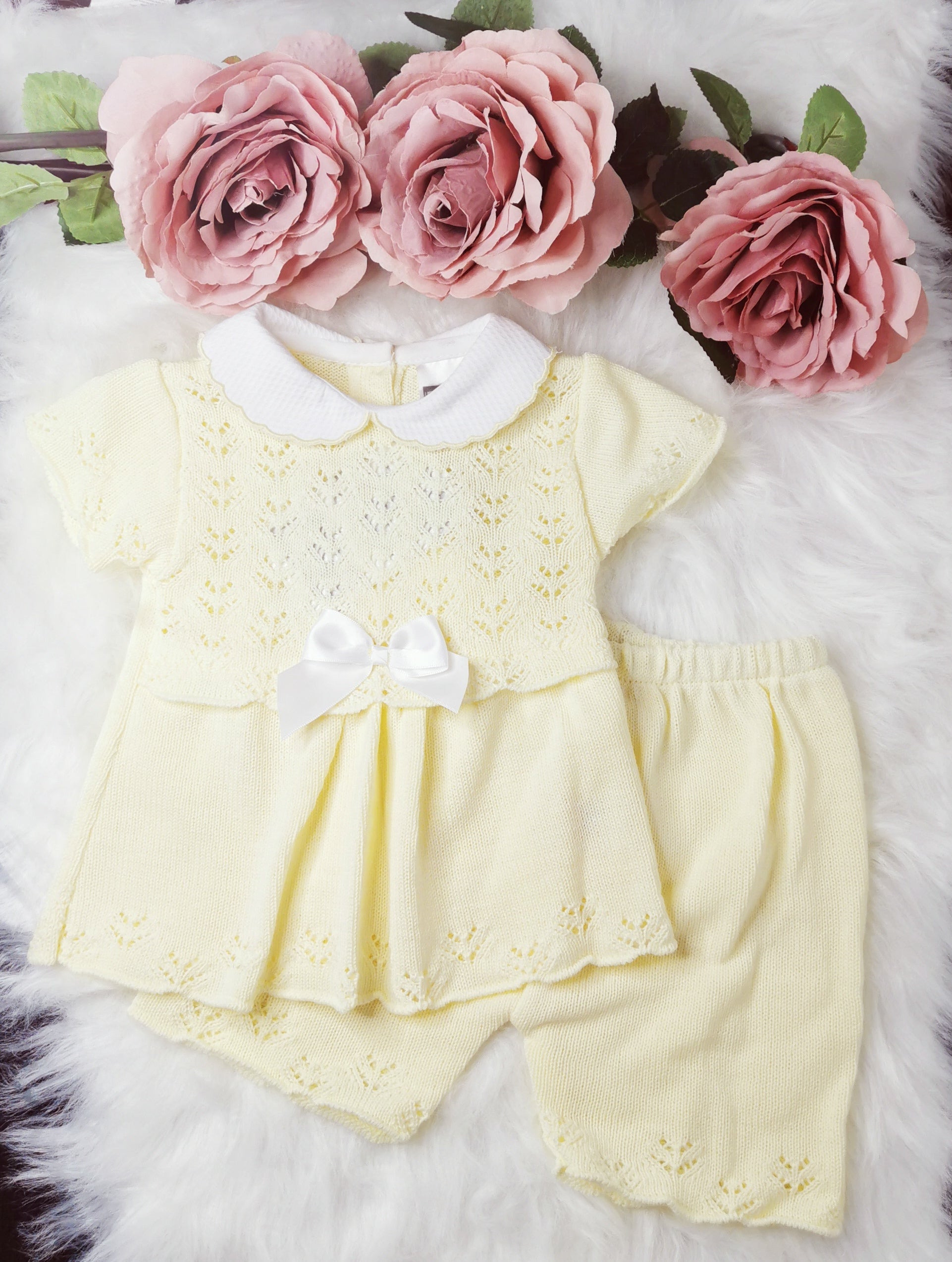 Perfect baby girls suit in pale lemon super soft knit. The top has a smart white pique collar with fancy knit design and white satin bow. Elastic waist shorts complete this adorable little outfit.