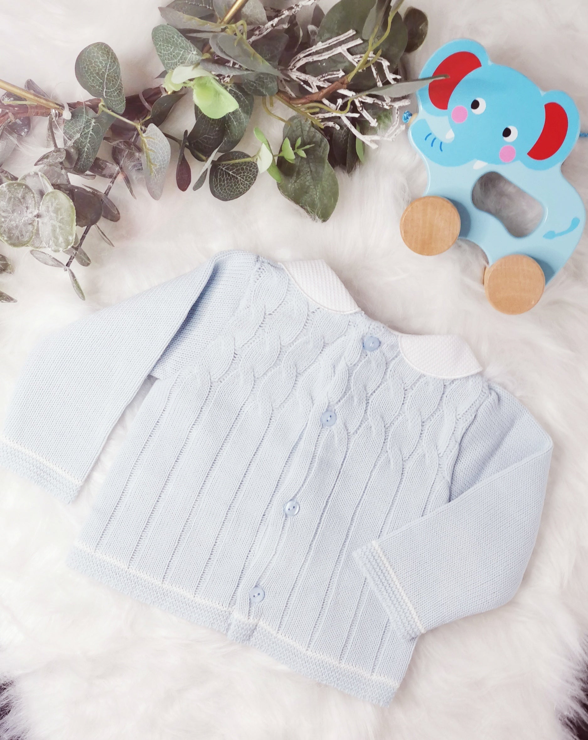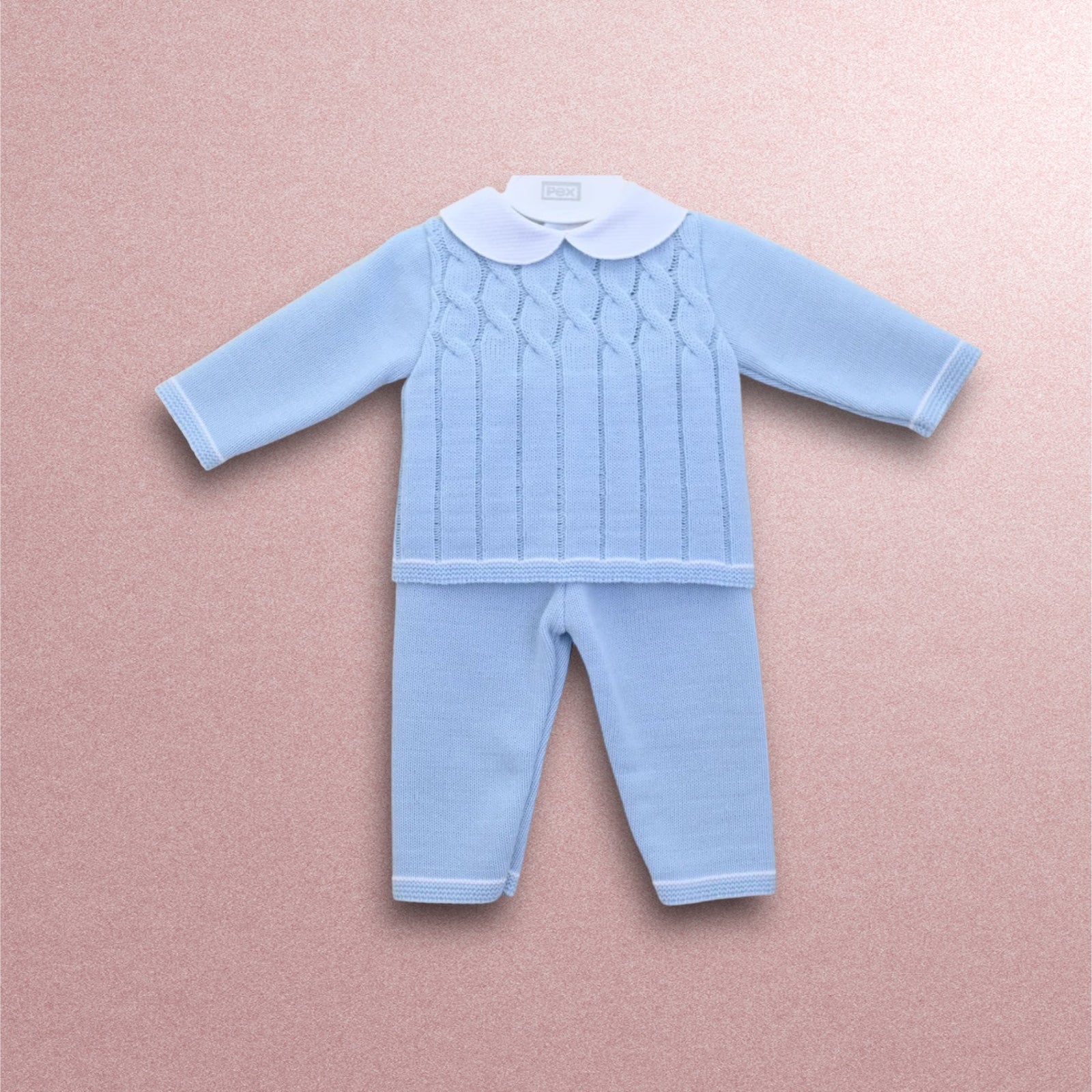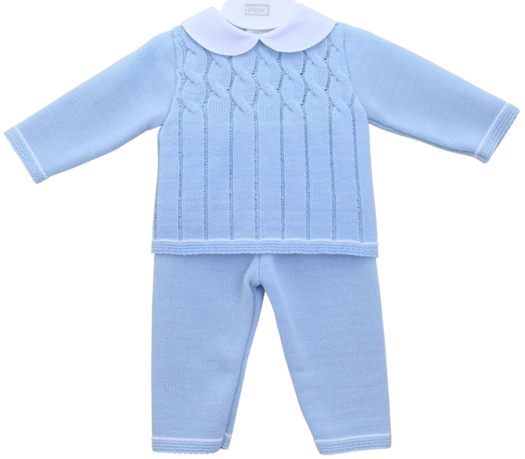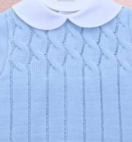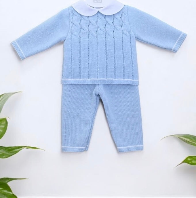 A charming baby boys two-piece knitted suit, made in super soft pastel blue yarn. The top has a classic peter pan style collar in white and there are attractive cable knit textures to the chest. The coordinating trousers are again in a super soft knit and they have a comfortably elasticated waistband.