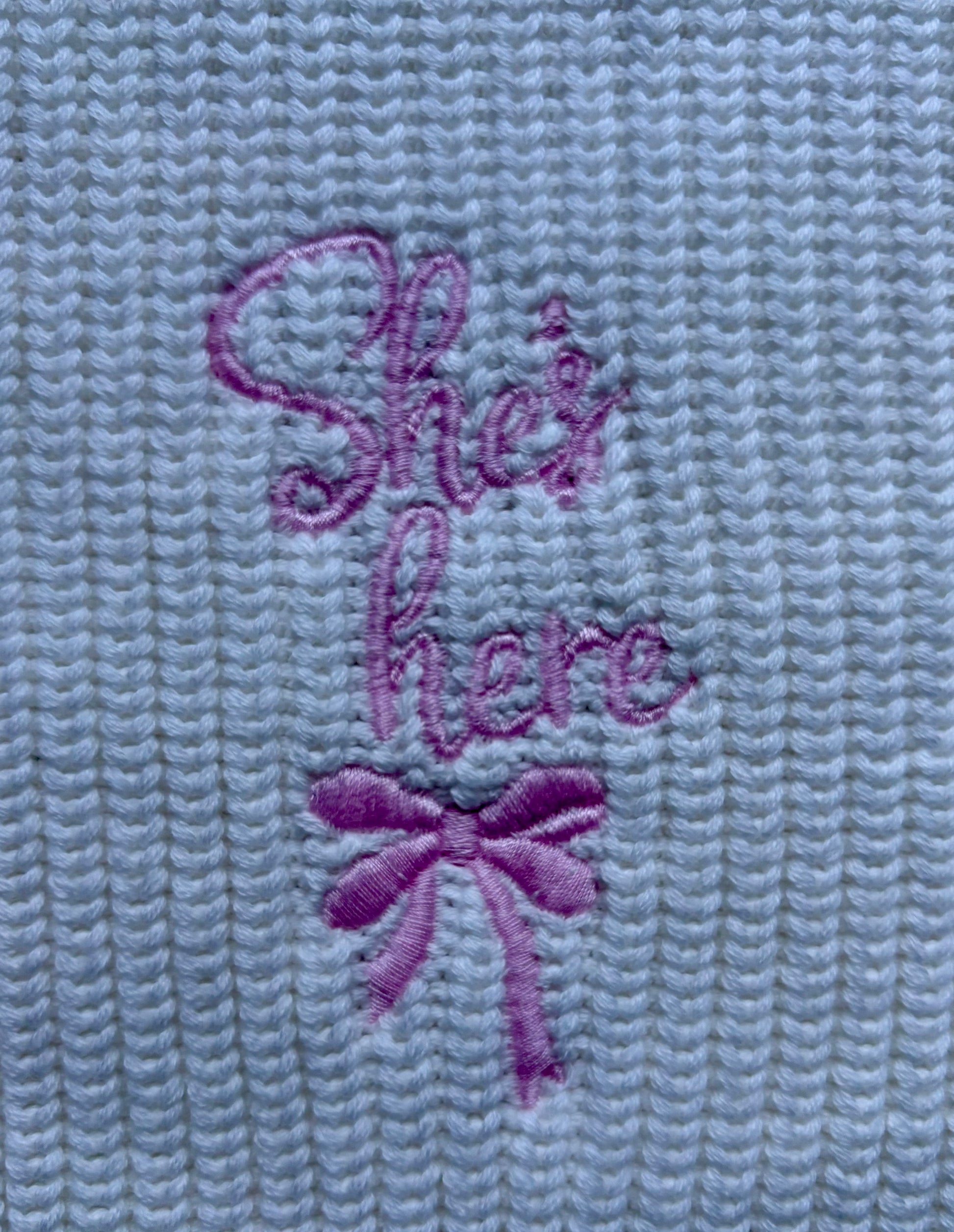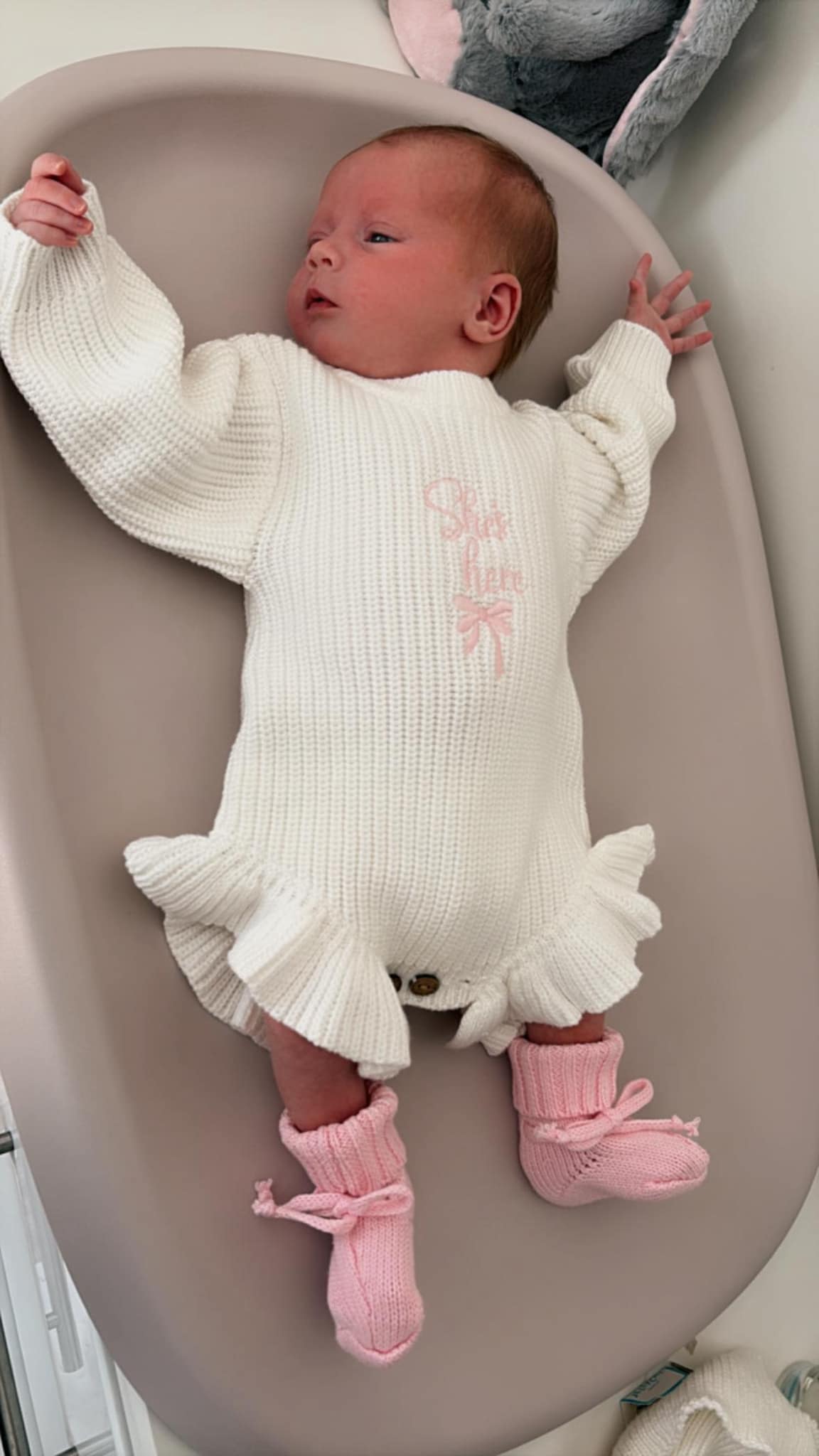 Celebrate your baby girl's arrival with this adorable knitted romper, beautifully embroidered with "She's here" and cute bow detail. Made from soft breathable cotton, this romper ensures ultimate comfort while keeping your newborn cosy, the frill legs and beautiful wooden button closures add that little touch of charm.
