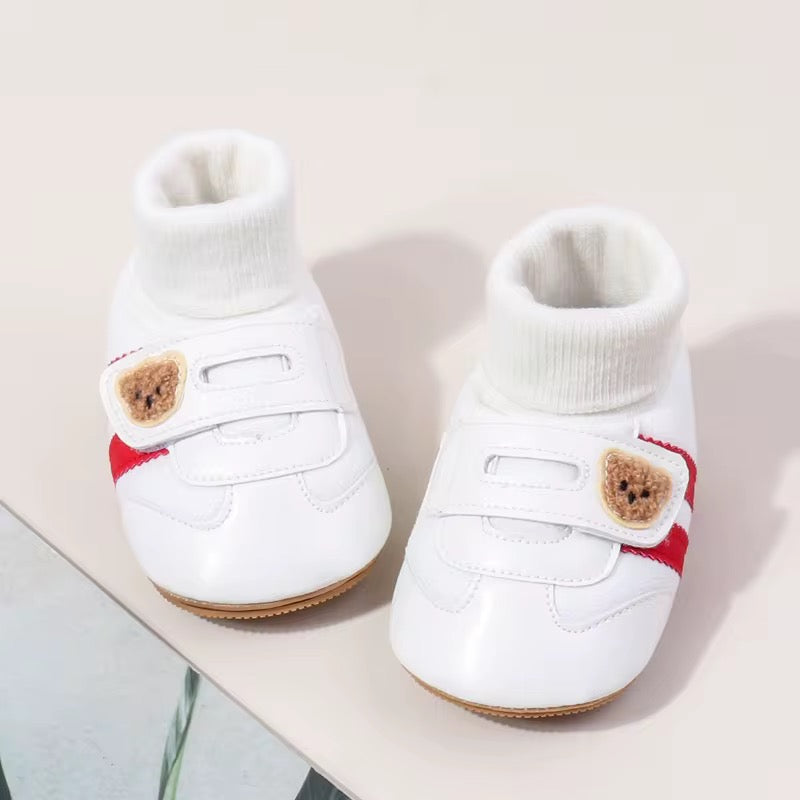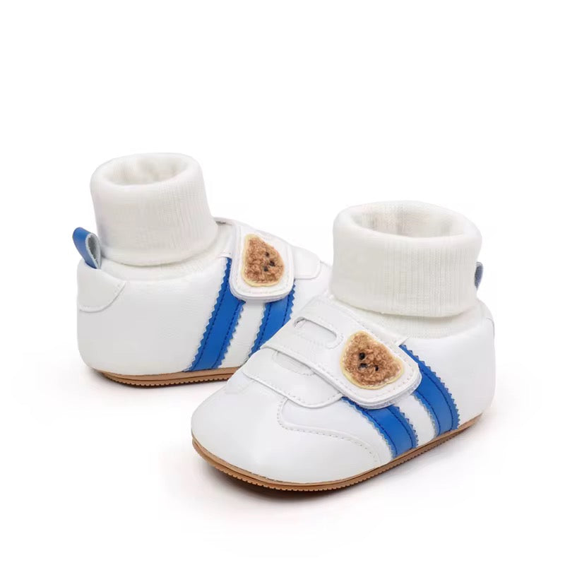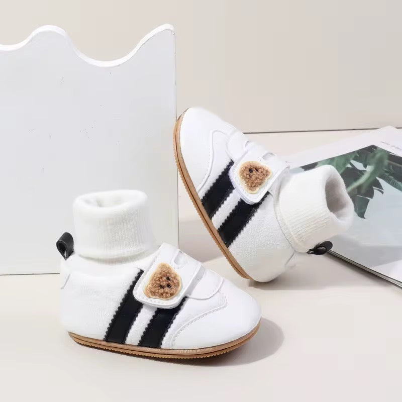 Pre-walkers - Add a touch of sporty charm to your little one's wardrobe with our adorable baby booties! Featuring a classic double-stripe design and and soft boucle teddy patch, these booties blend style and comfort perfectly keeping tiny feet cosy. perfect for every day wear, these booties are a must-have for stylish babies on the move.