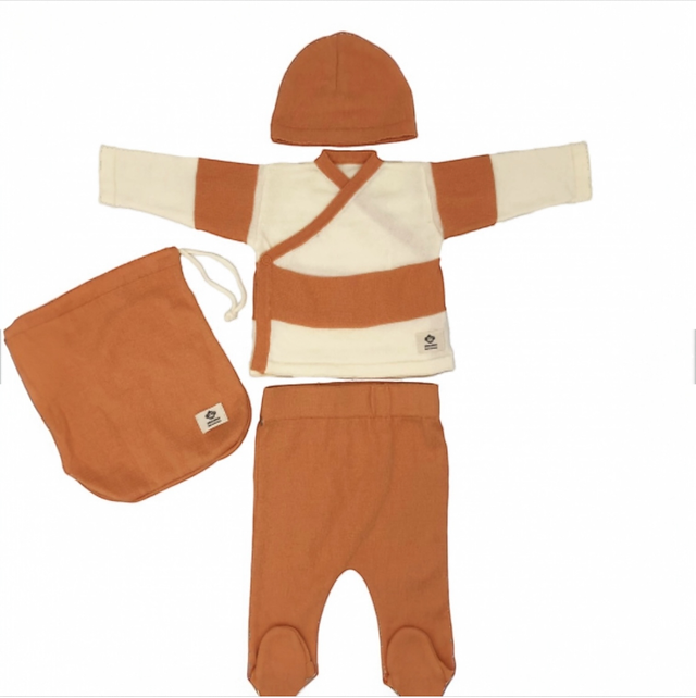 Designed in earthy orange and cream tones, this unisex newborn coming home outfit is perfect for both baby girls and boys. The practical wrap top makes dressing easier for parents, while the footed leggings ensure all-day comfort.