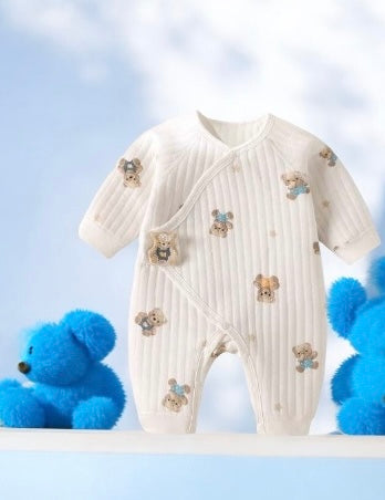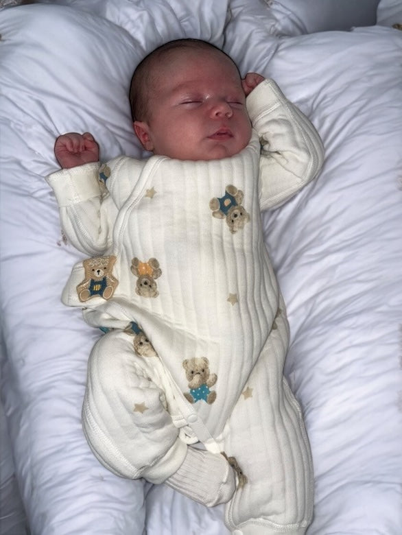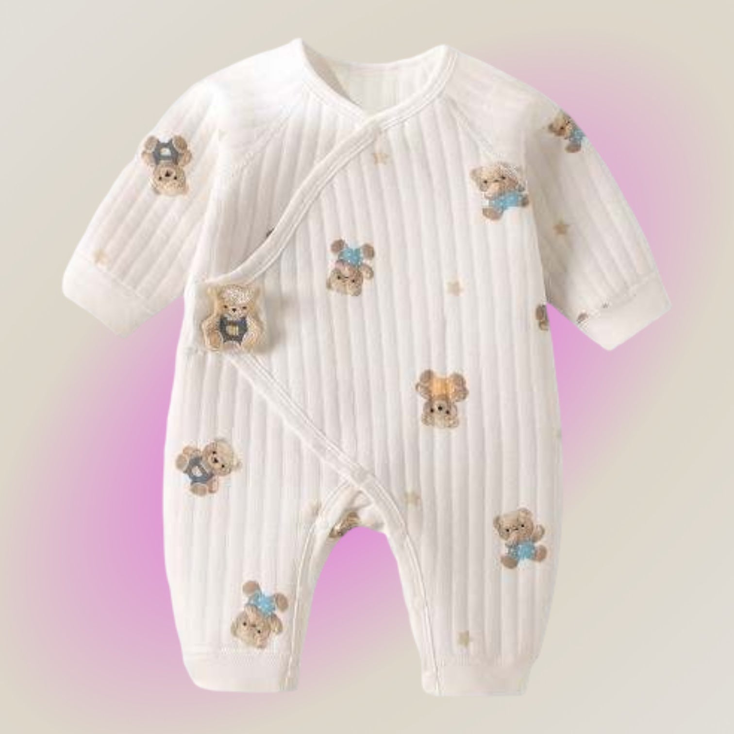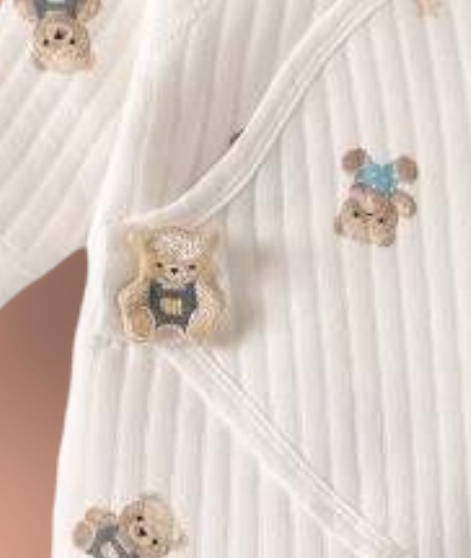 CHIC CUDDLES COLLECTION - Our darling little teddy bear romper is so adorable with little stars scattered between each teddy. It features a velcro embroidered teddy fastening to the waist with under poppers and little cuffed ankles.