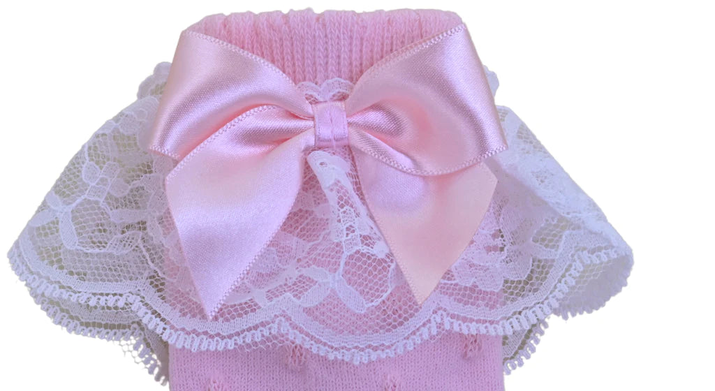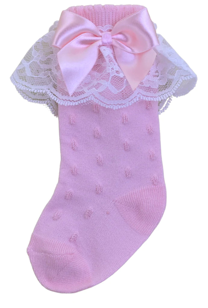 Beautiful girls knee high socks with elegant lace trim and gorgeous big silky bow. Featuring the prettiest spot texture, the cotton rich sock is knee high and trimmed with a fabulous deep lace and a silky ribbon bow. Fabulously soft and so so stylish they are perfect for teaming up with any pretty outfit.