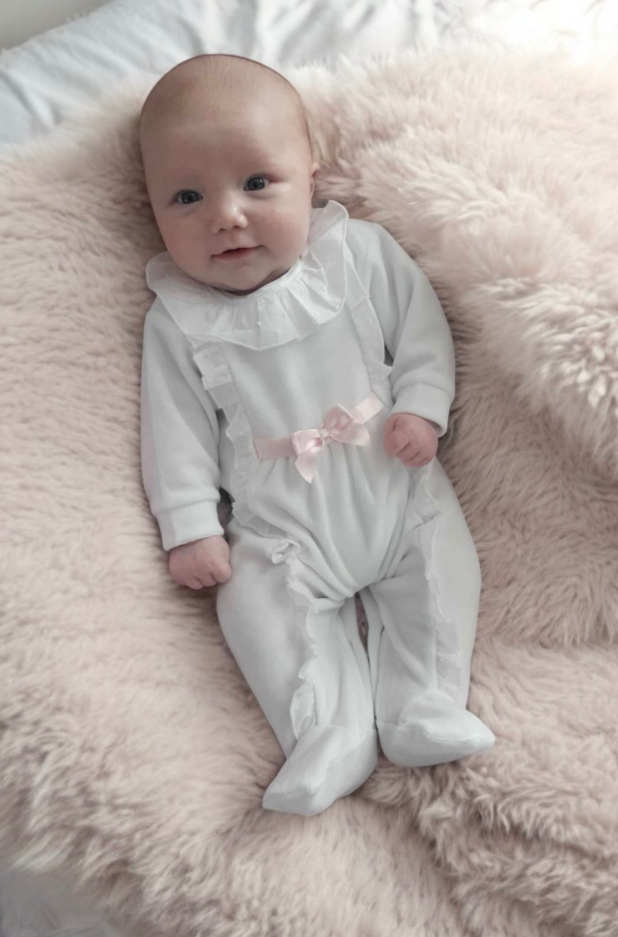 Victoria sleepsuit - White Velour Sleepsuit With Elegant Pink Satin Bow