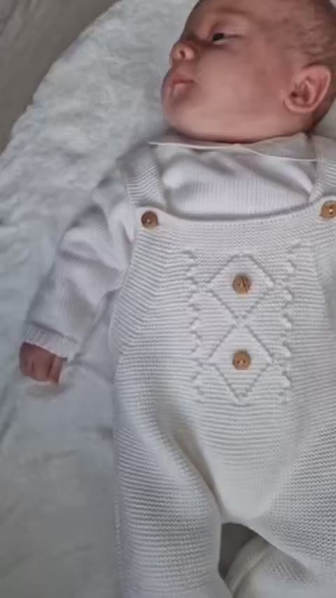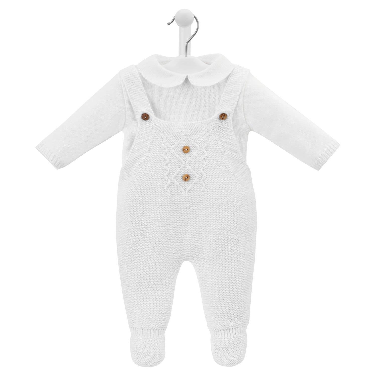 Knitted white dungarees with little wooden button on the straps for easy dressing. A white top with pique peter pan collar completes this adorable set.
