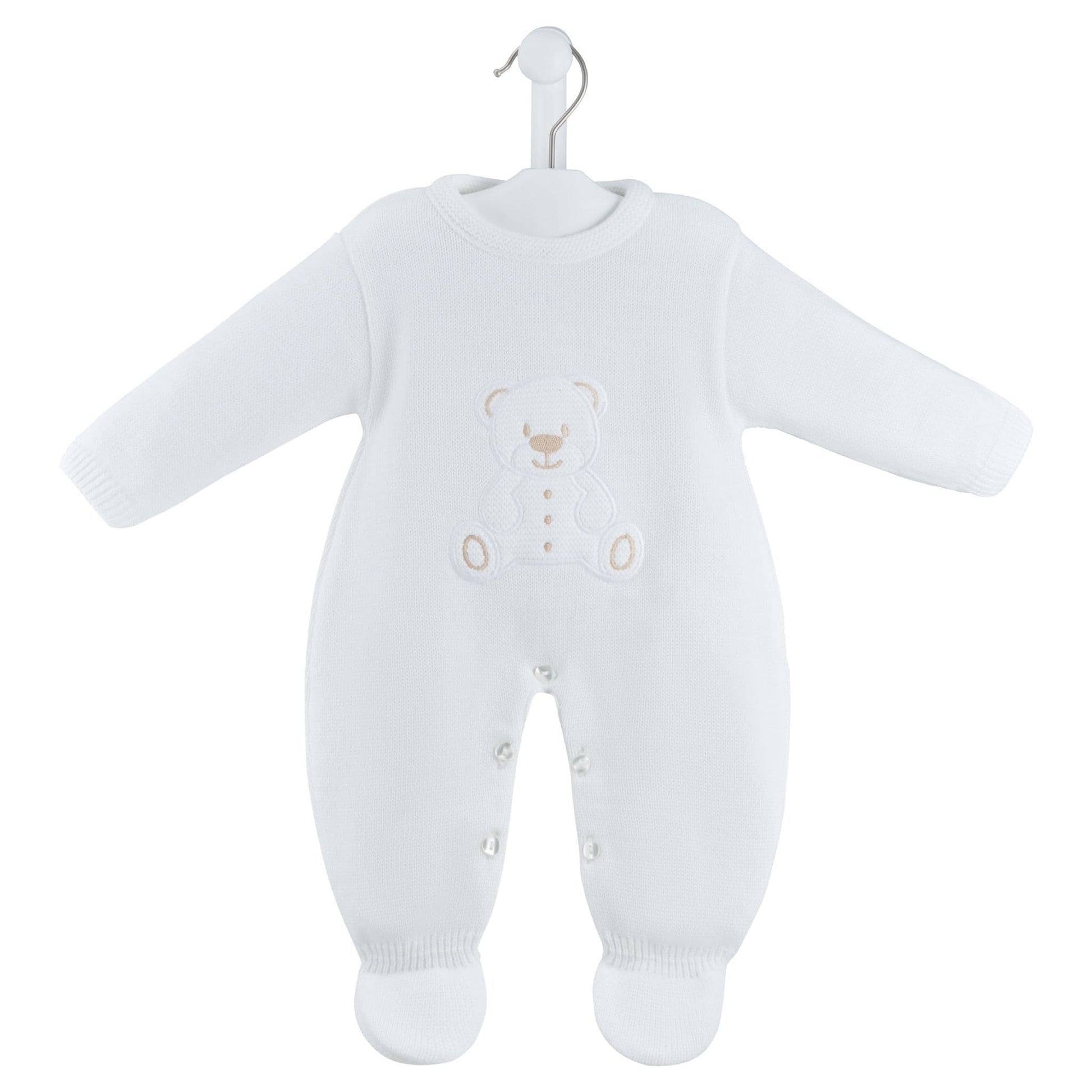 Adorable knitted onesie with embroidered teddy design.
